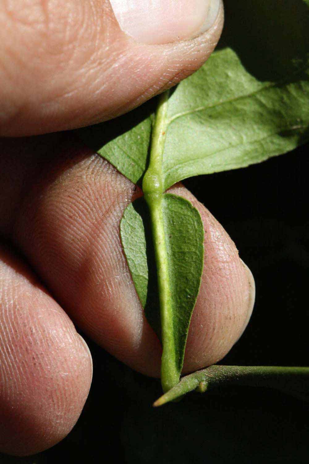 Crown compact or dense, not weeping. First-year twig surface glabrous; second- or third-year twig surface striate; thorns absent or not persistent; prickles absent or not persistent. Petiole glabrous, length medium, long or very long; wings narrow or medium, adjoining the blade. Leaflets one or three, margin bluntly toothed, rachis wings absent, shade leaflet blades weakly conduplicate, sun leaflet blades weakly or strongly conduplicate. Scent of crushed leaflets sweetly orange-like when crushed. Fruit as broad as long or longer than broad; rind yellow (7-10), yellow-orange (11), orange (12), or red-orange (13); rind texture slightly rough (4-5); firmness leathery; navel absent; flesh orange; taste sour.