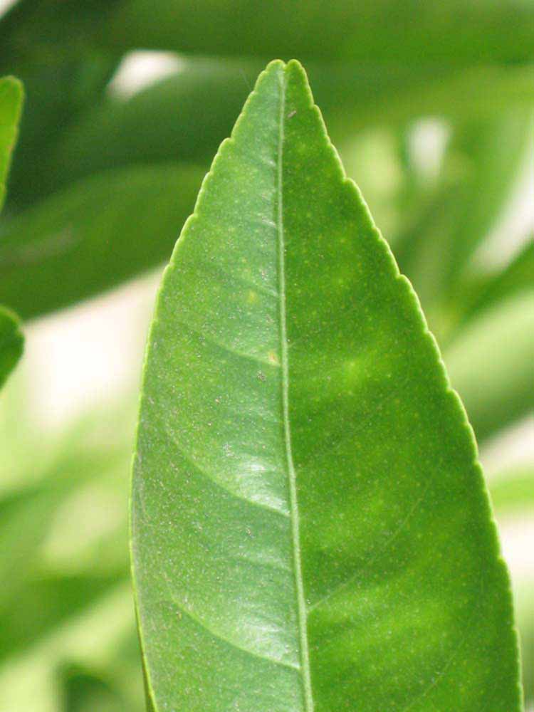 Crown compact or dense, not weeping. First-year twig surface glabrous; second- or third-year twig surface striate; thorns straight; prickles absent or not persistent. Petiole glabrous, length short; wings narrow, adjoining the blade. Leaflets one, margin crenate/crenulate or bluntly toothed, shade leaflet blades weakly conduplicate, sun leaflet blades weakly or strongly conduplicate. Scent of crushed leaflets mandarin-like. Fruit as broad as long or longer than broad; rind green-yellow (6), yellow (7-10), yellow-orange (11), or orange (12); rind texture medium rough (6-7) or rough (8); firmness leathery; navel absent; flesh orange; taste acidic-sweet.
