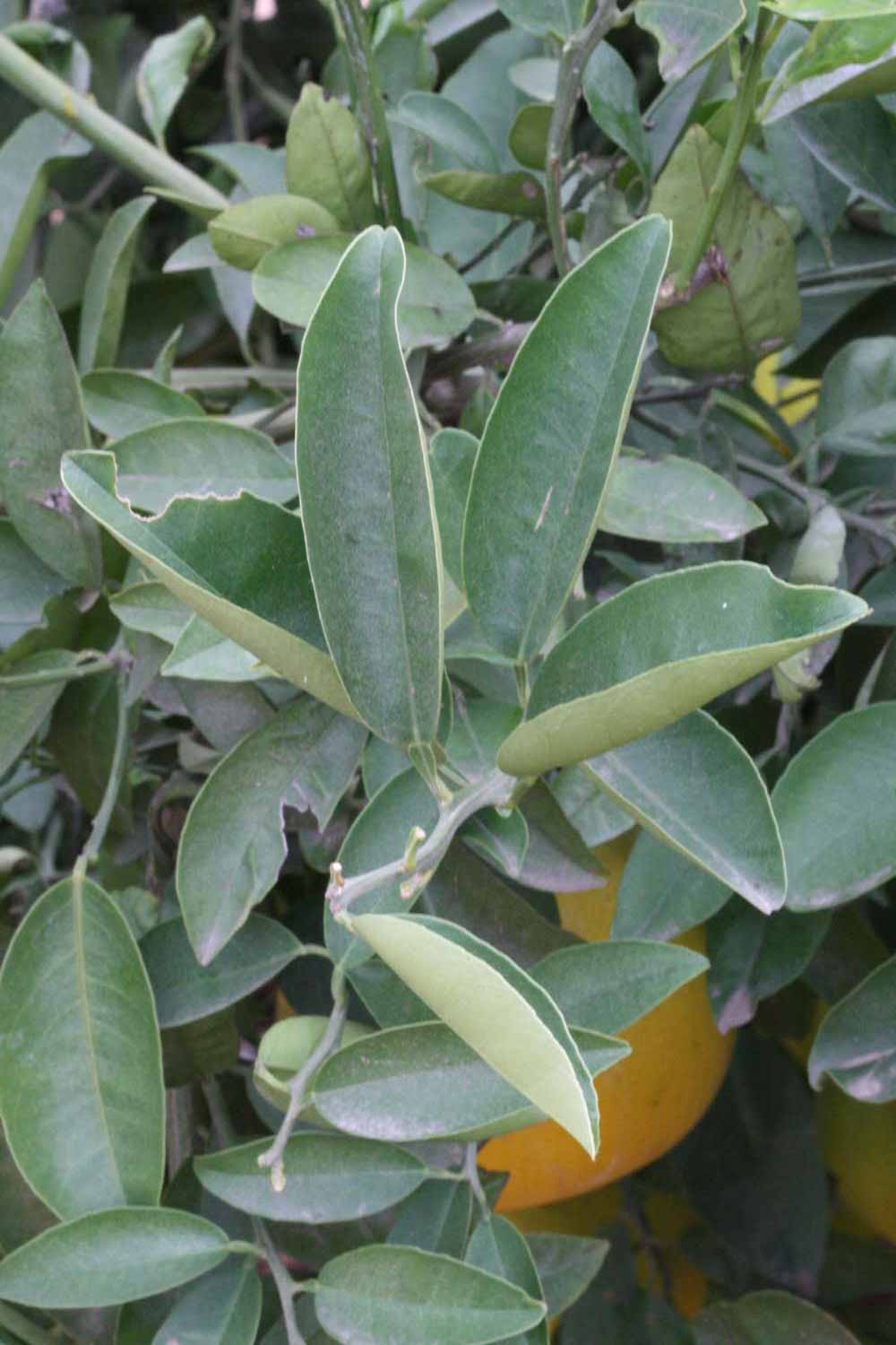 Crown compact or dense, not weeping. First-year twig surface pubescent; second- or third-year twig surface striate; thorns absent or not persistent or straight; prickles absent or not persistent. Petiole glabrous or pubescent, length medium; wings narrow, adjoining the blade. Leaflets one, margin entire or bluntly toothed, shade leaflet blades flat or weakly conduplicate, sun leaflet blades weakly or strongly conduplicate. Scent of crushed leaflets sweetly orange-like, spicy or peppery, freshly lemon-like, somewhat to strongly malodorous, or not scented. Fruit as broad as long or longer than broad; rind green-yellow (6), yellow (7-10), or yellow-orange (11); rind texture slightly rough (4-5); firmness leathery; navel absent; flesh orange or red/purplish-tinged; taste grapefruit-like.