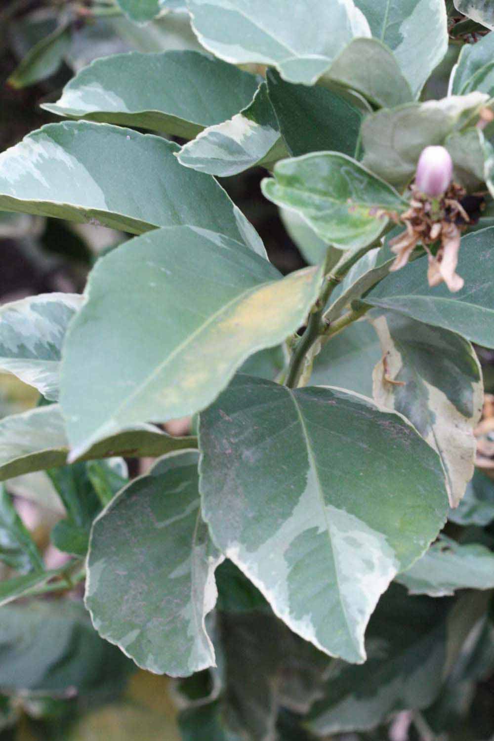 Crown compact or dense, not weeping. First-year twig surface glabrous; second- or third-year twig surface striate; thorns absent or not persistent or straight; prickles absent or not persistent. Petiole glabrous, length short; wings absent. Leaflets one, margin bluntly toothed, shade leaflet blades flat or weakly conduplicate, sun leaflet blades weakly conduplicate. Scent of crushed leaflets freshly lemon-like. Fruit as broad as long or longer than broad; rind variegated, green-yellow (6), yellow (7-10), or yellow-orange (11); rind texture slightly rough (4-5) or medium rough (6-7); firmness leathery; navel absent; flesh red/purplish-tinged; taste sour.