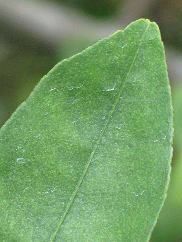 Tree medium in vigor and size, spreading and bushy with numerous, slender, willowy fine-stemmed branchlets densely armed with small, slender spines. Foliage dense and consists of small, pale green, broadly lanceolate, blunt-pointed leaves with definitely winged petioles. Flower buds and flowers small, and flowering occurs throughout year but mainly in spring and late summer. Not withstanding contrary statements in the literature, the new shoot growth is faintly purple-tinted and flower buds and young flowers faintly purple-tinged. Coloration fades rapidly, however, especially if the weather is warm, and is soon lost. Very sensitive to cold.