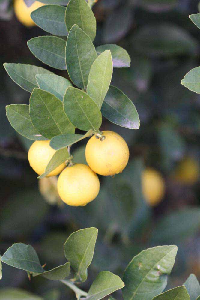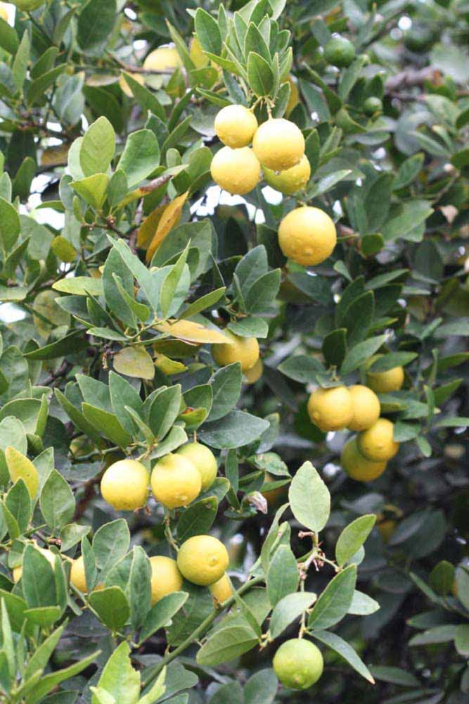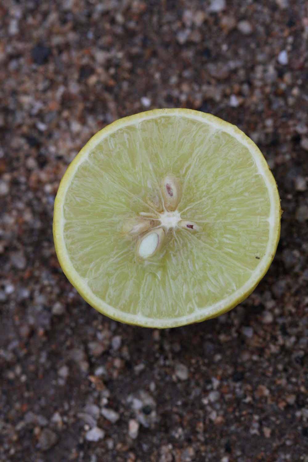 "Fruit very small, round, obovate or short-elliptical; base usually rounded but sometimes with slight neck; apex also rounded but usually with small, low, and faintly furrowed nipple. Moderately seedy and highly polyembryonic. Rind very thin; surface smooth, leathery; tightly adherent; color greenish-yellow at maturity, following which it drops from the tree. Segments 10 to 12; axis very small and usually solid. Flesh color greenish-yellow; fine-grained, tender, juicy; highly acid with distinctive aroma. Somewhat everbearing but crop comes mainly in winter (earlier in very hot climates).