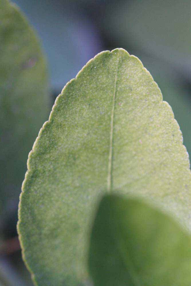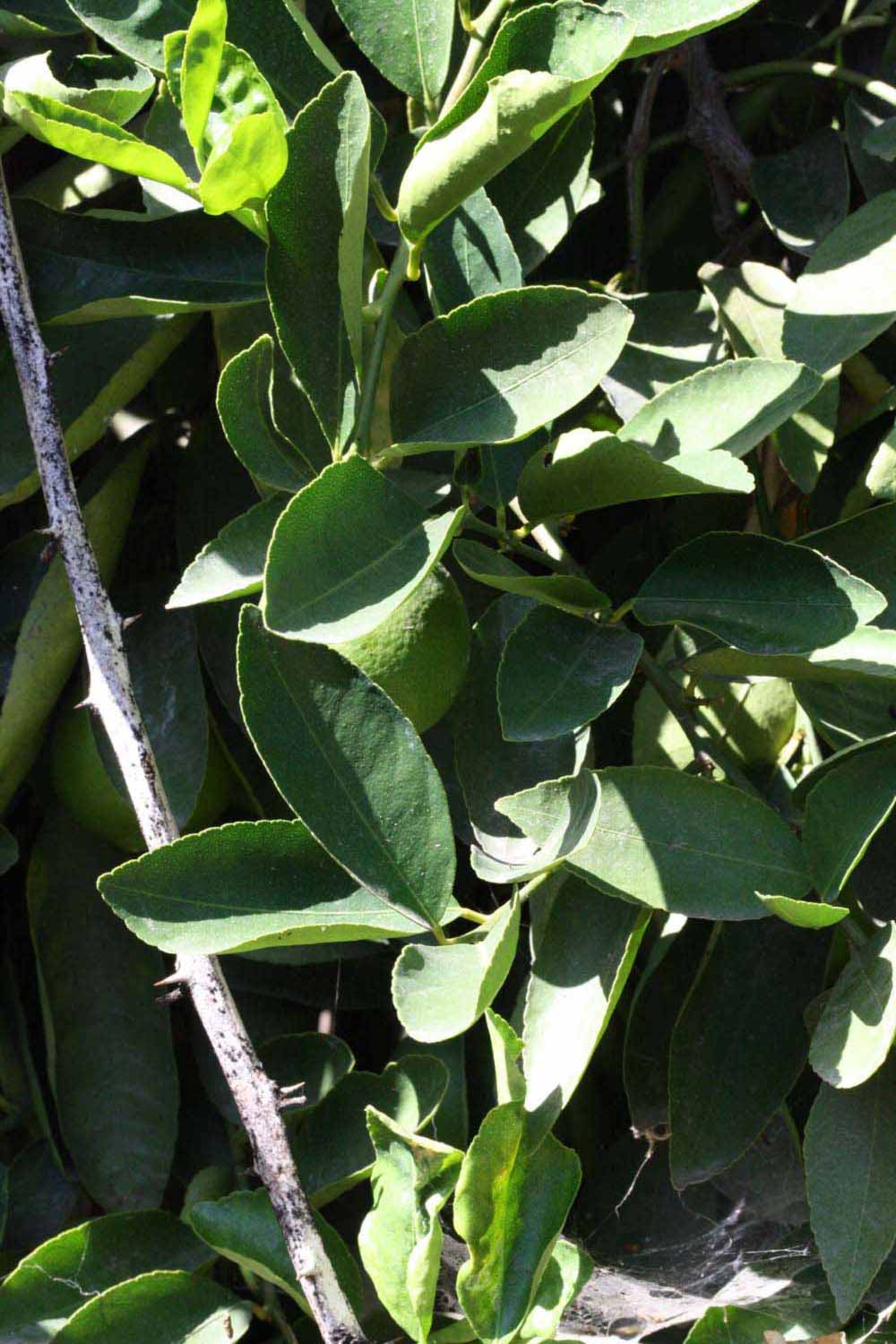 Crown compact or dense, not weeping. First-year twig surface glabrous; second- or third-year twig surface striate; thorns straight; prickles absent or not persistent. Petiole glabrous, length short; wings narrow, adjoining the blade. Leaflets one, margin bluntly toothed, shade leaflet blades weakly conduplicate, sun leaflet blades weakly or strongly conduplicate. Scent of crushed leaflets freshly lemon-like. Fruit as broad as long or longer than broad; rind light green with some break to yellow (5), green-yellow (6), or yellow (7-10); rind texture smooth (1-3) or slightly rough (4-5); firmness leathery; navel absent; flesh green/greenish; taste sour.