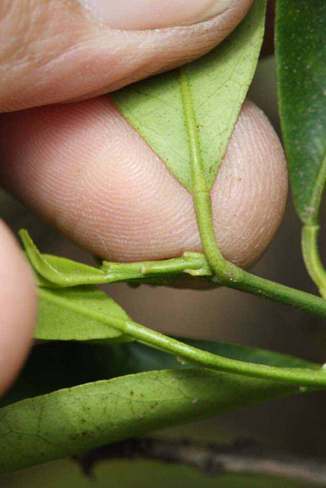 Crown compact or dense, not weeping. First-year twig surface glabrous; second- or third-year twig surface striate; thorns absent or not persistent; prickles absent or not persistent. Petiole glabrous, length medium; wings narrow, adjoining the blade. Leaflets one, margin bluntly toothed, shade leaflet blades weakly conduplicate, sun leaflet blades weakly or strongly conduplicate. Scent of crushed leaflets mandarin-like. Fruit broader than long; rind yellow-orange (11), orange (12), or red-orange (13); rind texture slightly rough (4-5); firmness leathery; navel absent; flesh orange; taste acidic-sweet.