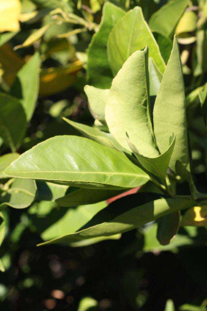 Crown compact or dense, not weeping. First-year twig surface glabrous; second- or third-year twig surface striate; thorns absent or not persistent; prickles absent or not persistent. Petiole glabrous, length medium; wings narrow, adjoining the blade. Leaflets one, margin entire (by misinterpretation) or bluntly toothed, shade leaflet blades weakly conduplicate, sun leaflet blades weakly or strongly conduplicate. Scent of crushed leaflets sweetly orange-like. Fruit as broad as long or longer than broad; rind yellow (7-10), yellow-orange (11), orange (12), or red-orange (13); rind texture slightly rough (4-5); firmness leathery; navel absent; flesh orange; taste acidic-sweet.