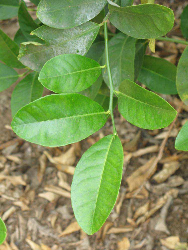 Crown compact or dense, not weeping. First year twig surface glabrous; second or third year twig surface striate; thorns straight; prickles absent or not persistent. Petiole glabrous, length short, wings absent. Leaflets one, margin bluntly toothed, shade leaflet blades weakly conduplicate, sun leaflet blades weakly or strongly conduplicate. Leaflets freshly lemon-like when crushed. Fruit as broad as long or longer than broad, rind green-yellow (6), yellow (7-10) or yellow-orange (11), rind texture slightly rough (4-5), firmness leathery, navel absent, flesh yellow, taste sour.