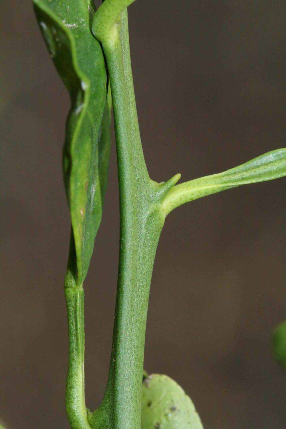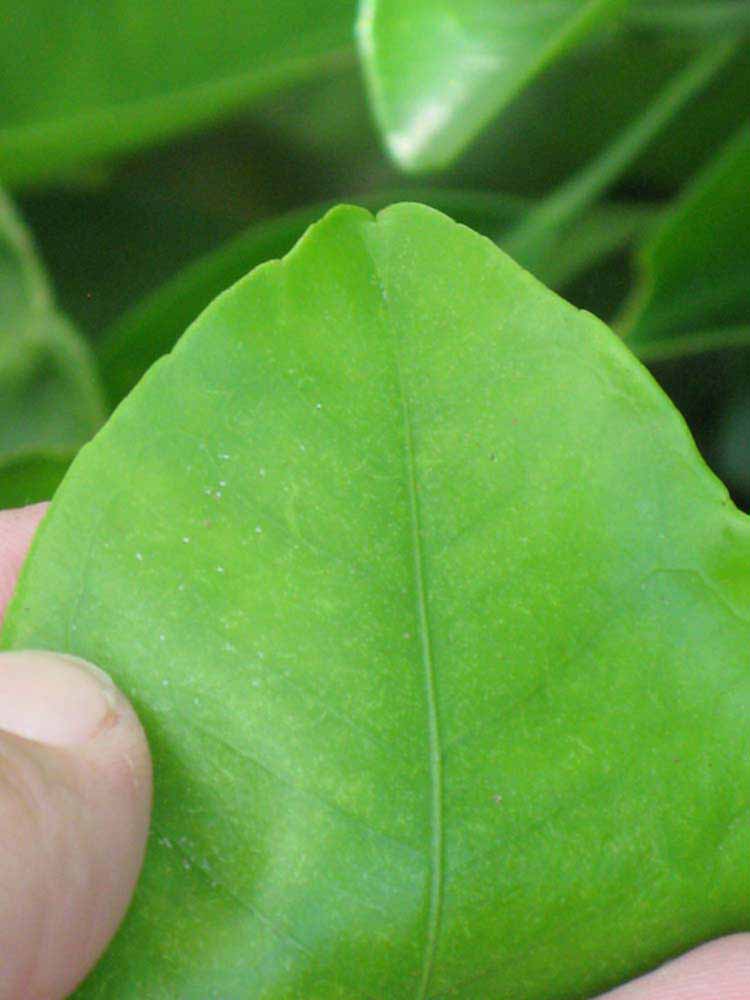 Crown compact or dense, not weeping. First-year twig surface glabrous; second- or third-year twig surface striate; thorns straight; prickles absent or not persistent. Petiole glabrous, length short, medium or long; wings narrow, adjoining the blade. Leaflets one, margin entire or bluntly toothed, shade leaflet blades weakly conduplicate, sun leaflet blades strongly conduplicate. Scent of crushed leaflets mandarin-like. Fruit broader than long; rind yellow (7-10), yellow-orange (11), or orange (12); rind texture slightly rough (4-5); firmness leathery; navel absent; flesh orange; taste sour.