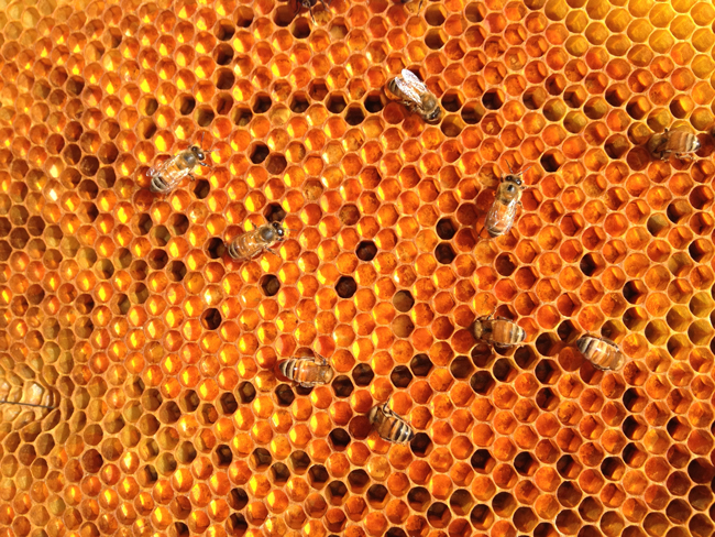 In the case of honey bound, it appears as honey-filled cells or cells being filled with incoming nectar that may lead to the designation of the colony being honey bound. In instances of a strong nectar flow, and no or too few empty comb cells in supers (or no supers on the colony), the worker bees will store the nectar in worker cells of the brood nest. The queen will not be able to restock the cell with an egg. Thus brood rearing space may be limited. This is seldom a problem since following the nectar flow, in most locations and in most seasons, the colony will begin to limit brood rearing following the summer solstice.