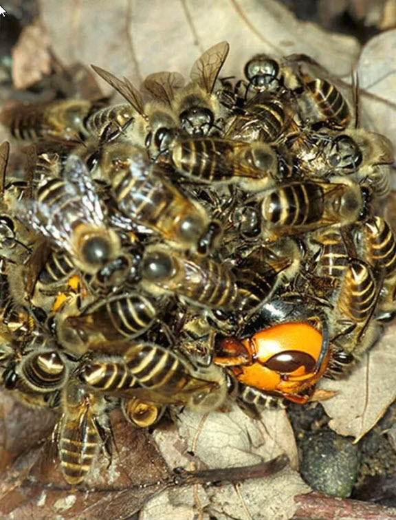 Workers may also ball enemies such as hornets or other wasps to kill them. A photo at right shows eastern honey bees (Apis cerana) balling a hornet.