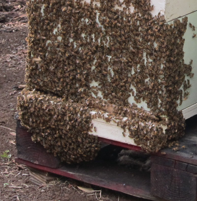 Bees gathering about or hanging from the hive entrance, beneath hive bottom, or on the outside of the box above the entrance on hot days, warm and humid evenings, or when colony population within hive is dense. Bearding bees numbering into the hundreds and not attempting to enter the hive but often returning inside when the weather cools overnight or the next day.