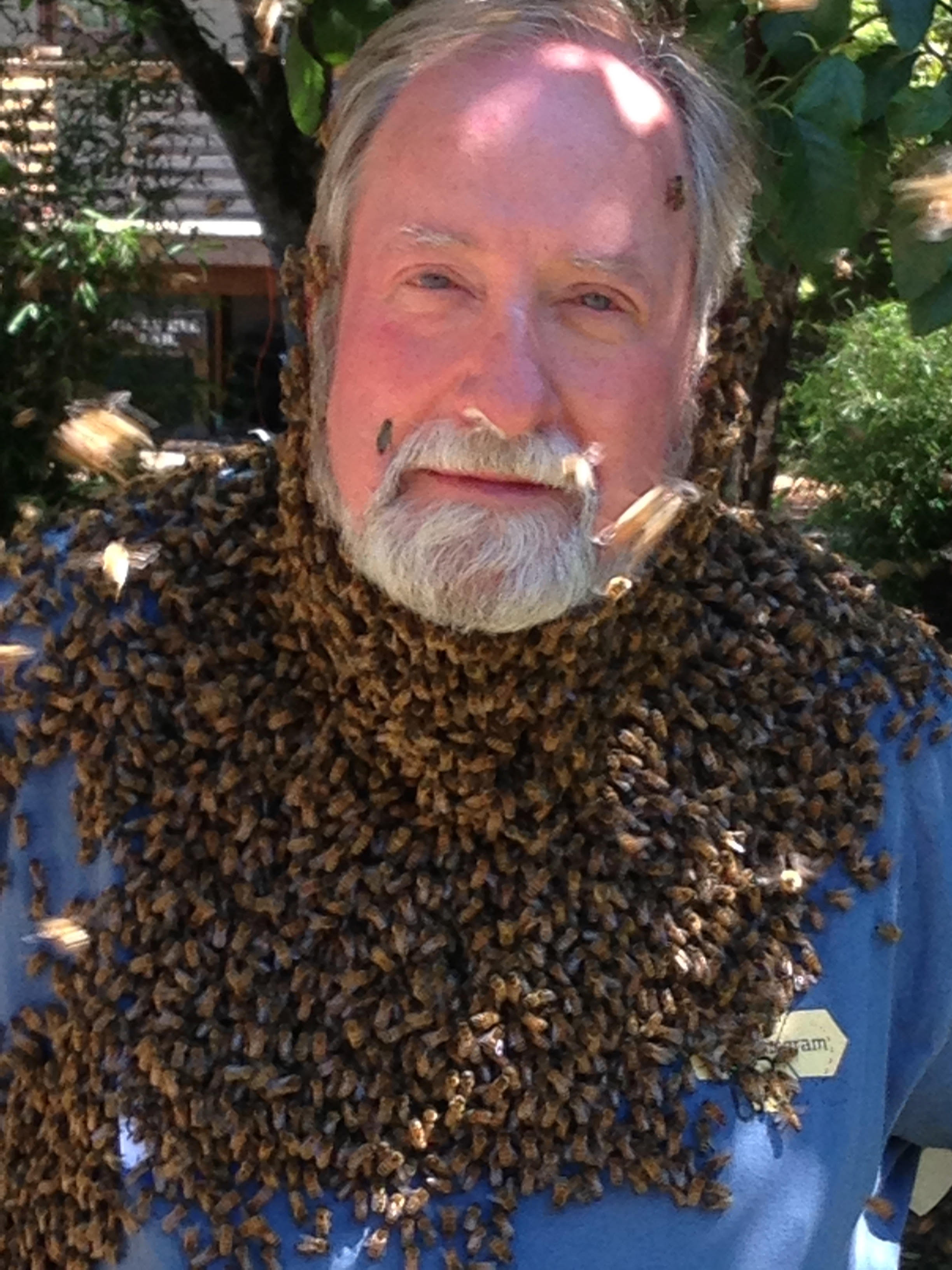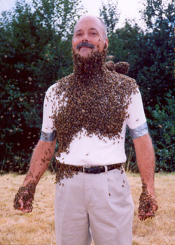 A bee beard can be created on a human by hanging caged queen or queen substance below the chin so bees create a beard-like cluster within several minutes.