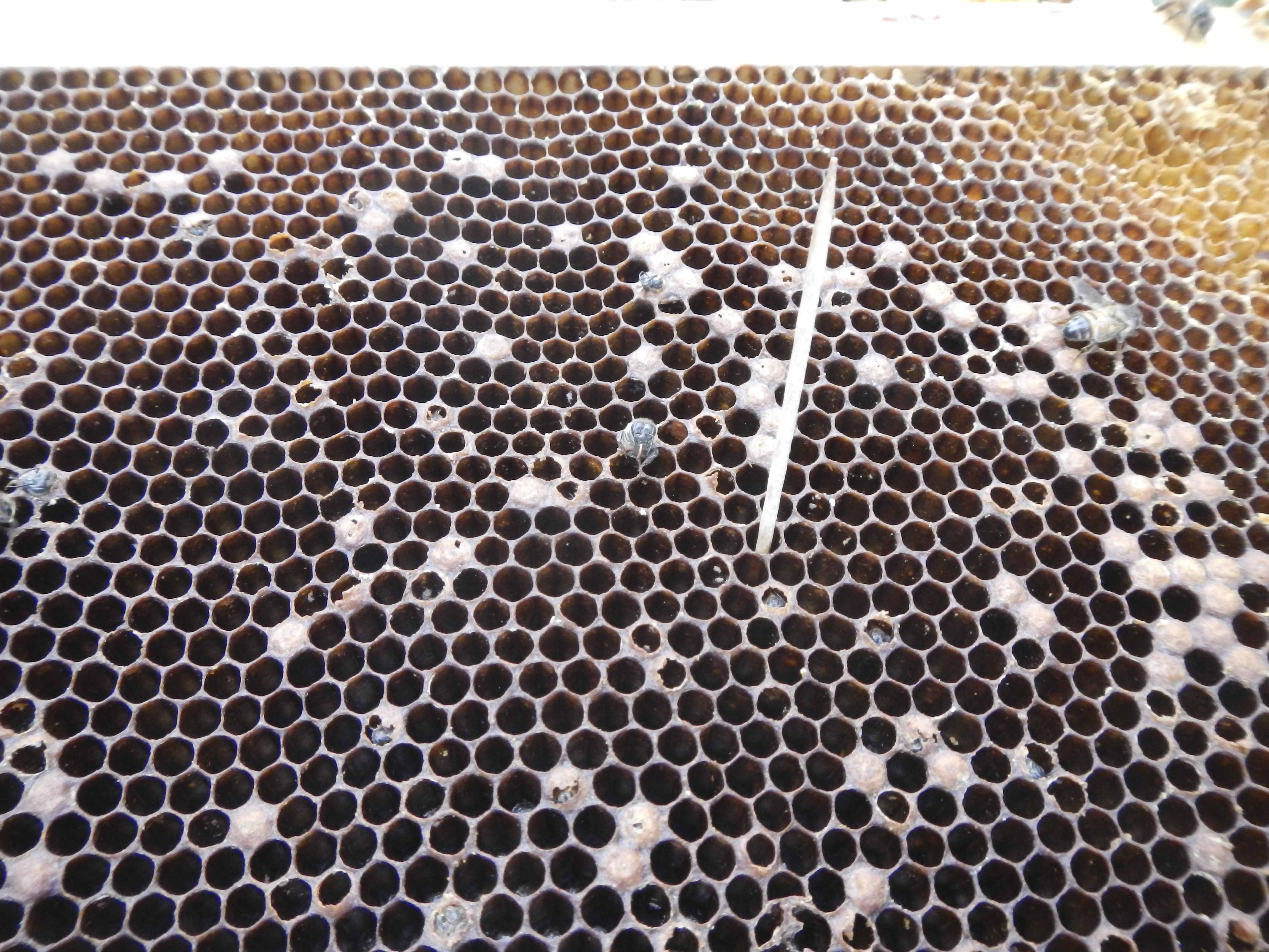 cells opened and pupae showing evidence of being removed and eaten. Imbalance of brood from the normal ratio of roughly 1 egg to 2 larvae to 4 capped brood is evidence that larvae are not being properly fed.