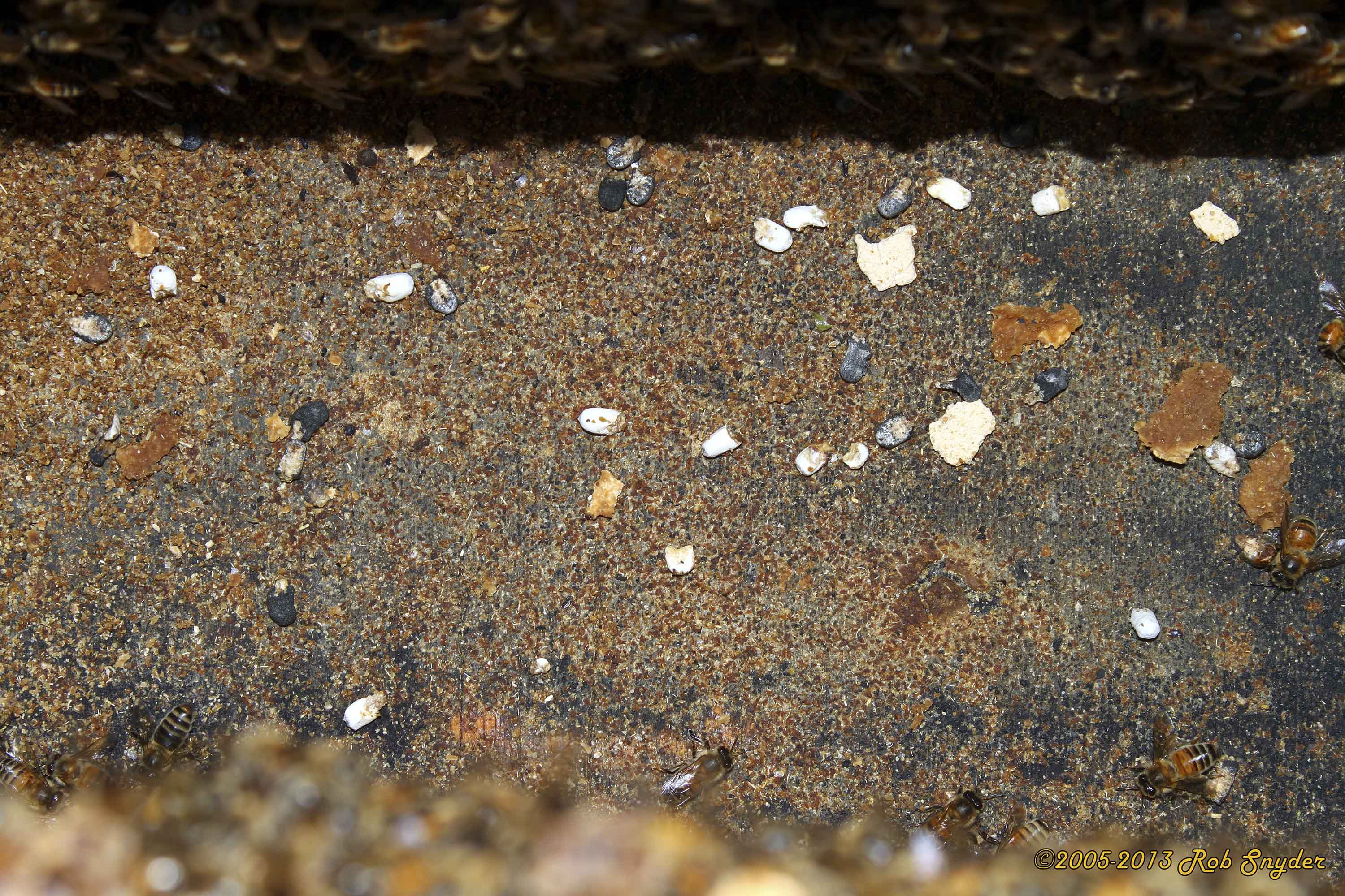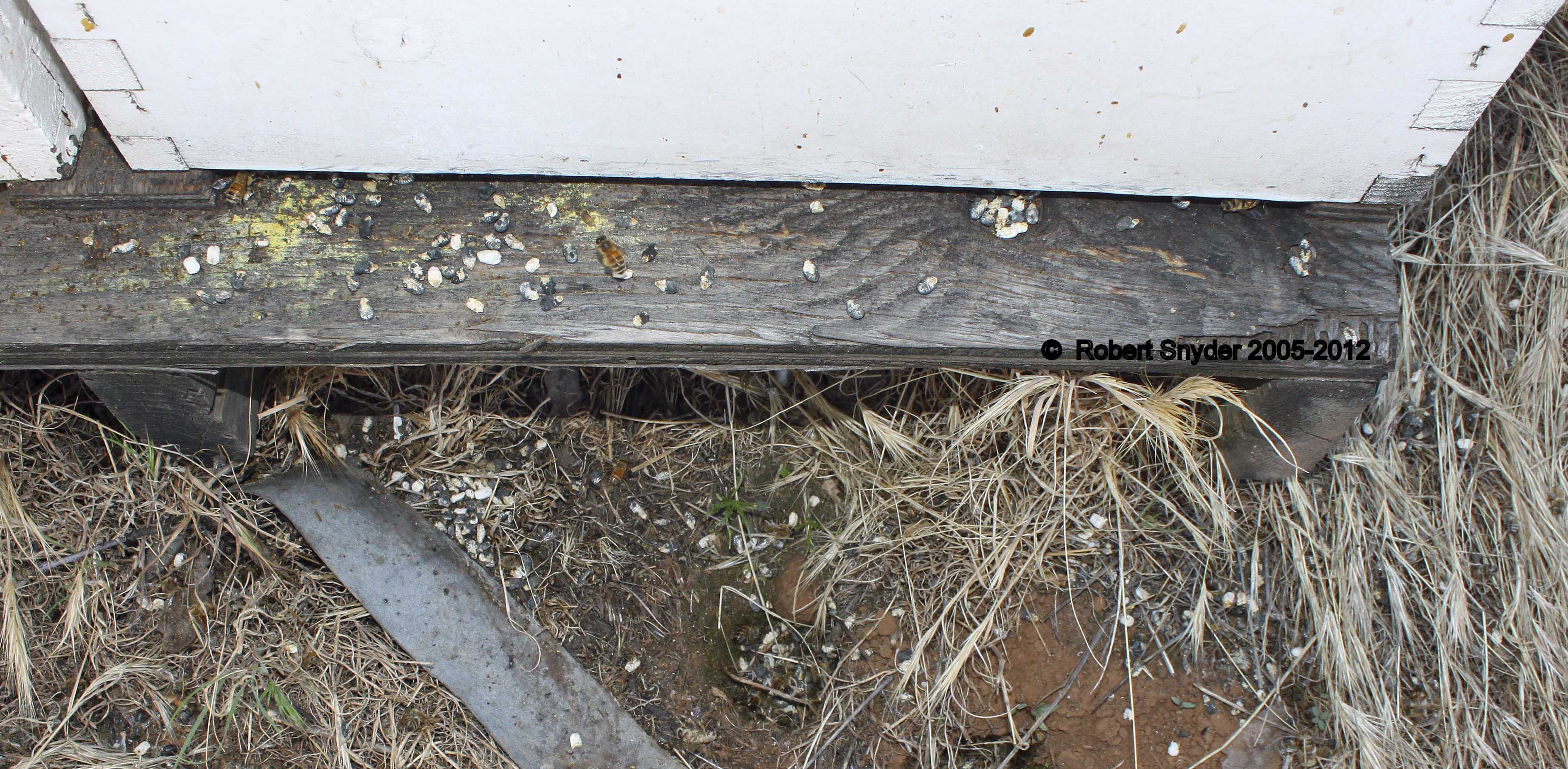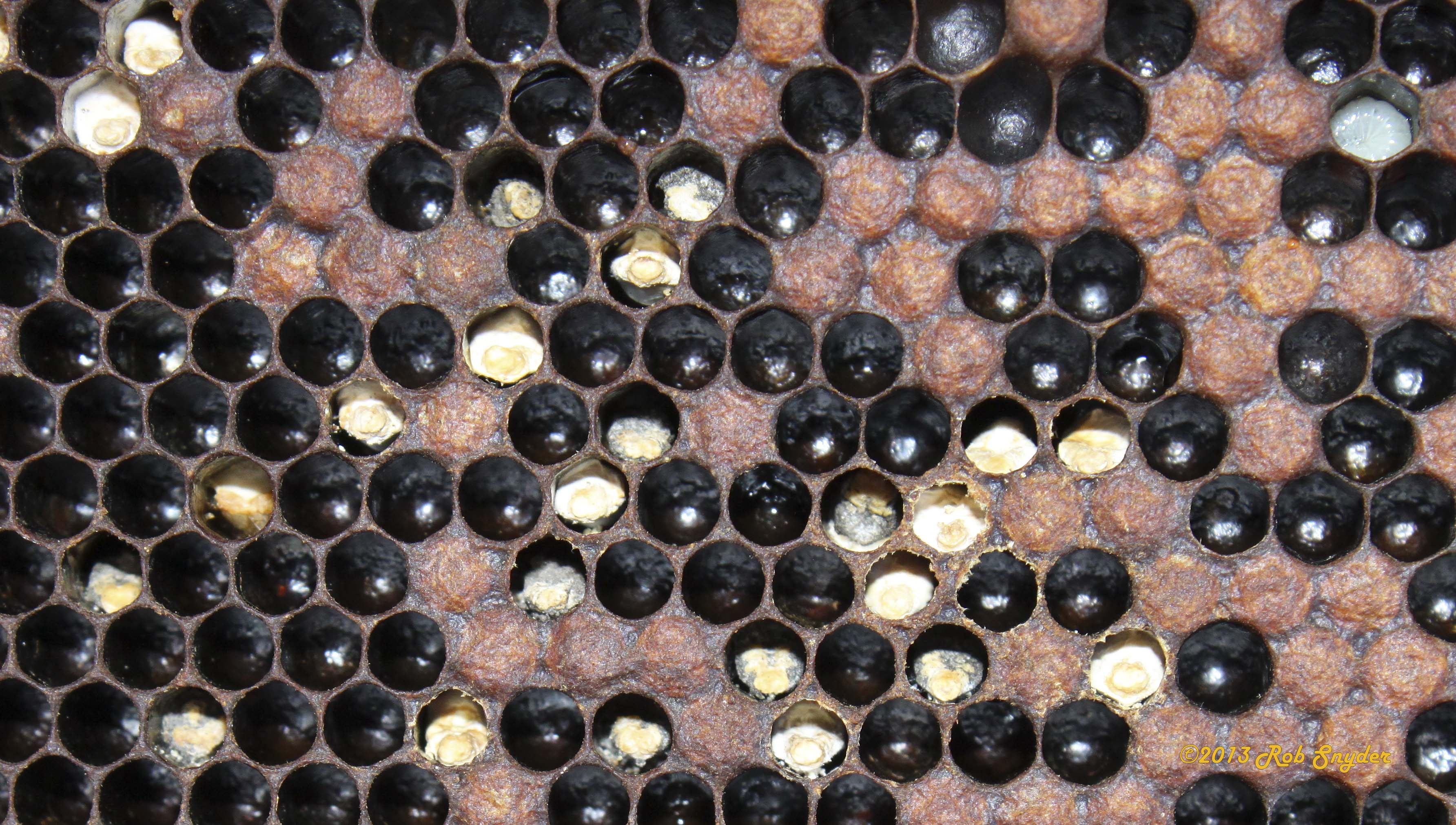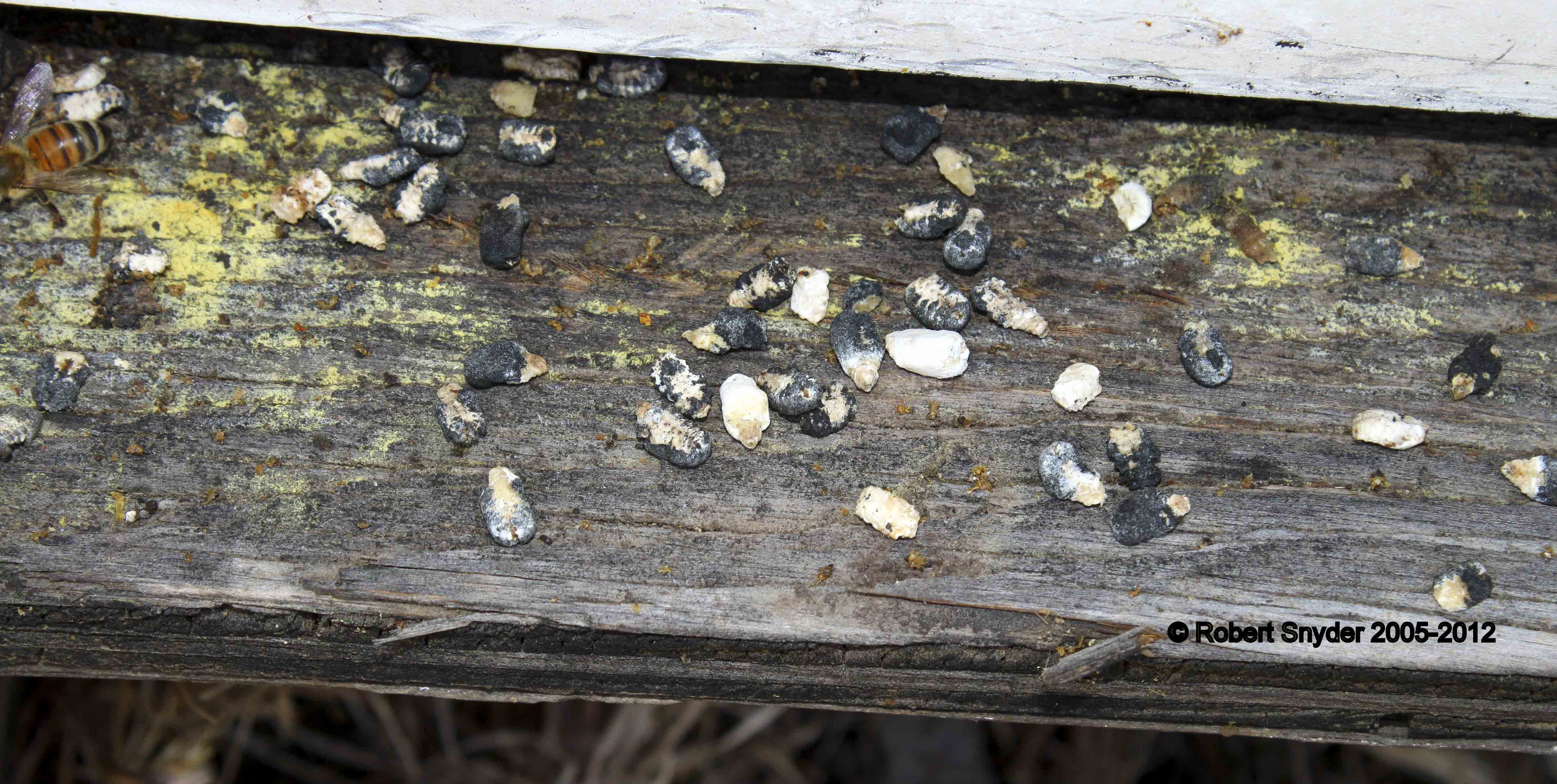 Dead off-color larvae usually have a fluffy, cotton-like appearance. Mummified larvae may be mottled with brown or black spots, especially on the undersides. Larvae that have been dead for a long time may become completely black. Desiccated mummies are shrunken, hard, and resemble small pieces of chalk. May rattle in comb when shaken. May be especially evident during spring but then may disappear with improving environmental conditions.