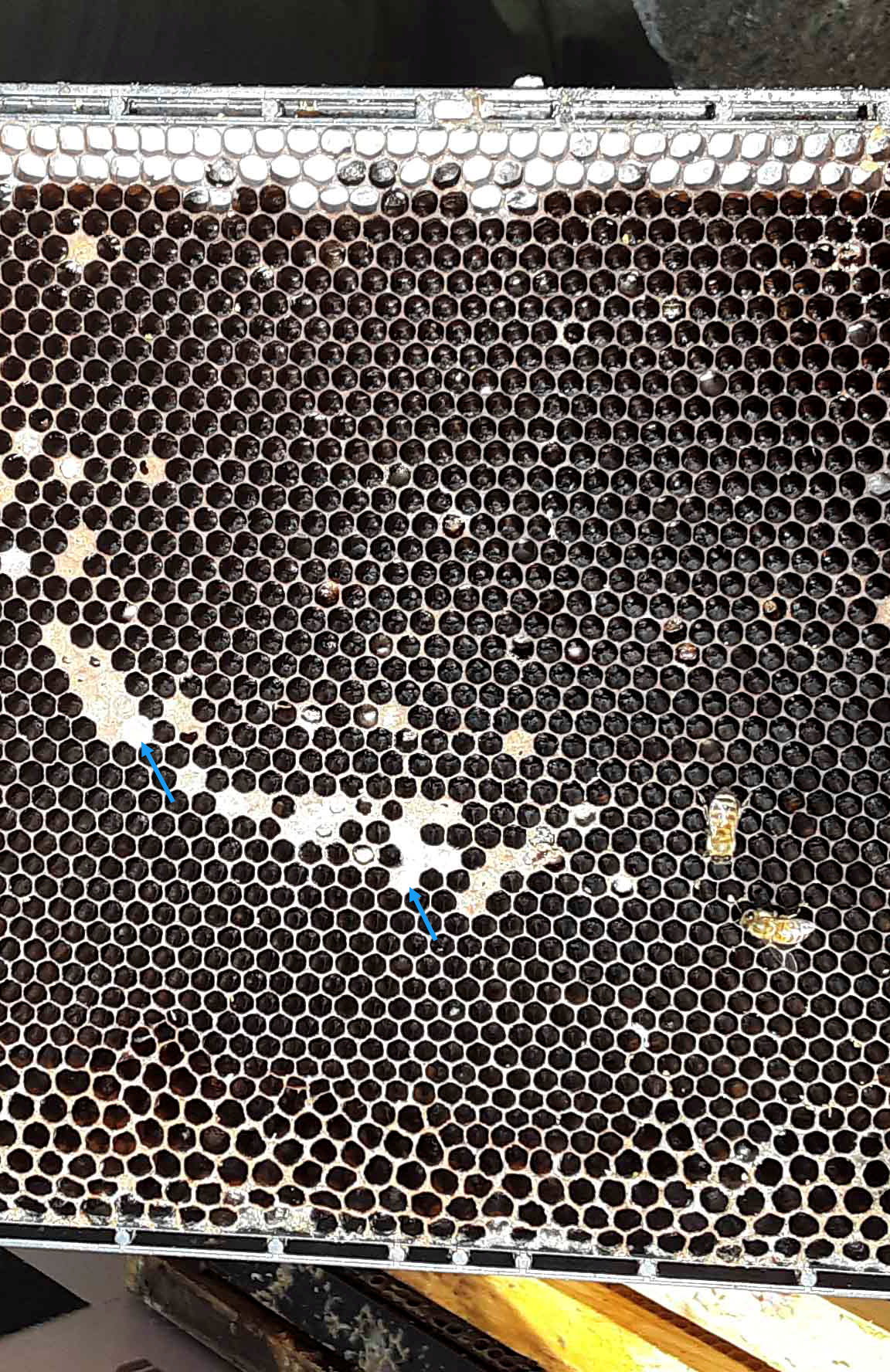 cells with discolored, shrunken pupae are slowly uncapped and removed by adult bees.