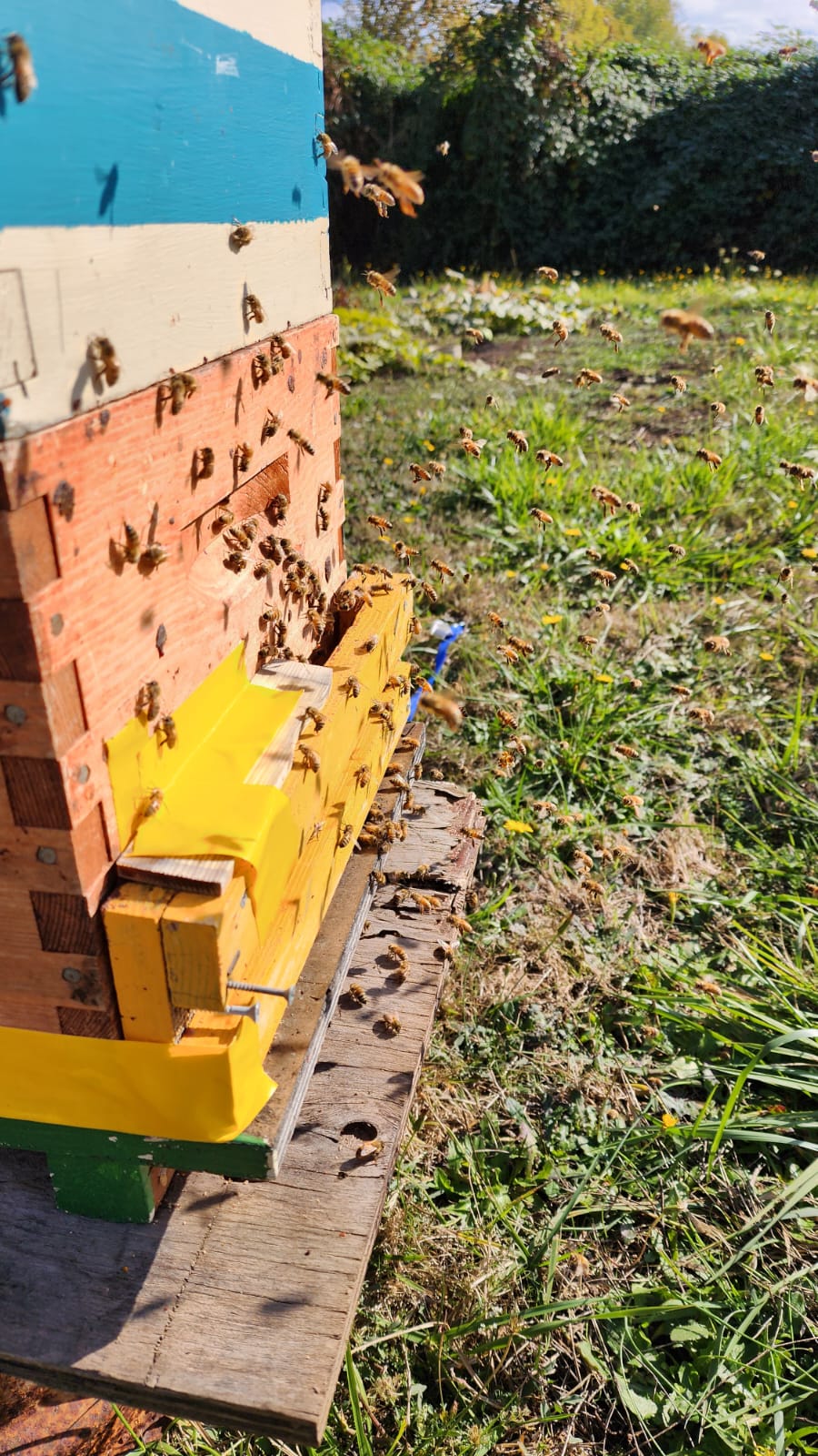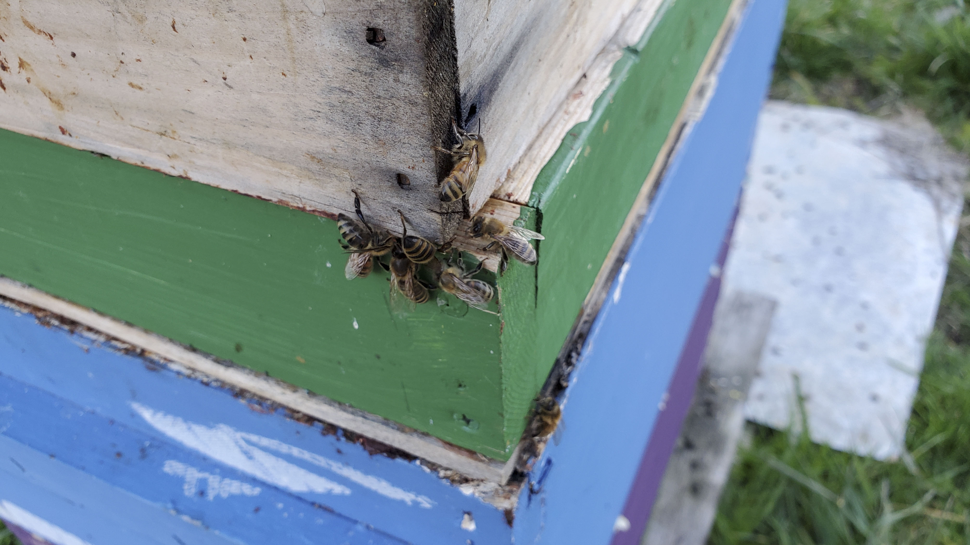 Heavily laden foragers may land in the grass, on the ground, on the sides of their hives, or on other structures on their return to the hive. This may also occur when entrance foraging traffic is especially heavy. Watching the entrance, it is possible to distinguish foraging flight to or from the colony entrance from worker orientation flights or drone flights in afternoons for mating. Robbing flight entrance also differs but is sometimes hard to distinguish form normal foraging.