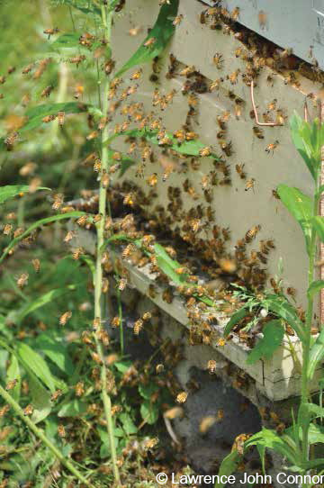 Drones fly mainly in the afternoon and in spring once they reach mating age. Their mating flights can mean heavy flight activity at the entrance. Likewise, when major nectar plants are in full bloom, worker flight activity at the entrance can be heavy. Flight of workers and drones is more direct into and out of the entrance compared with orientation flights.