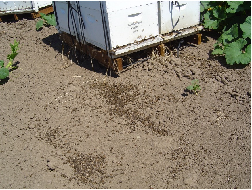 Chronic bee loss is elusive to determine and presents general signs characteristic of other causes. Dwindling colony populations (when other colonies are doing better), weak or stressed colonies, poor overwintering, and/or colonies with parasitic mite syndrome (PMS) may be suffering from pesticide exposure. Following acute or chronic events, bees cleaning bee bread from cells is often evident.