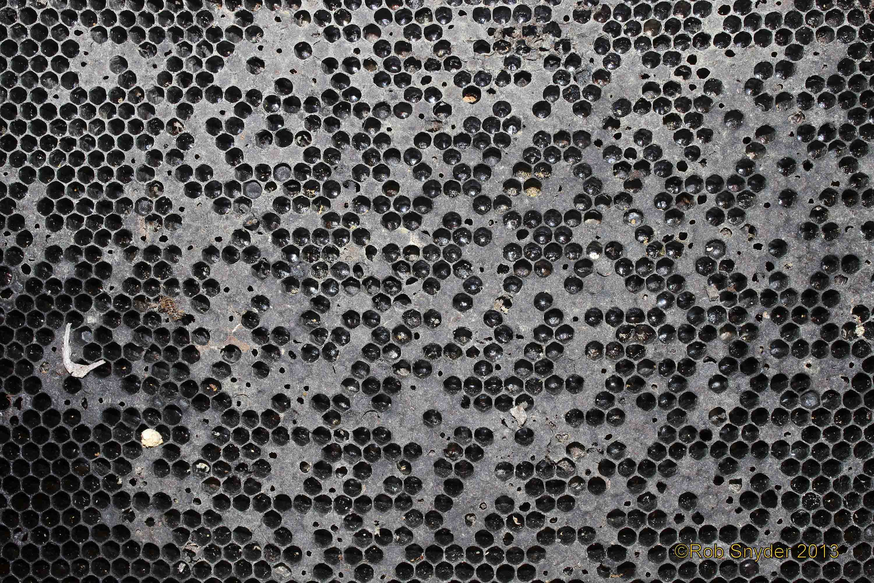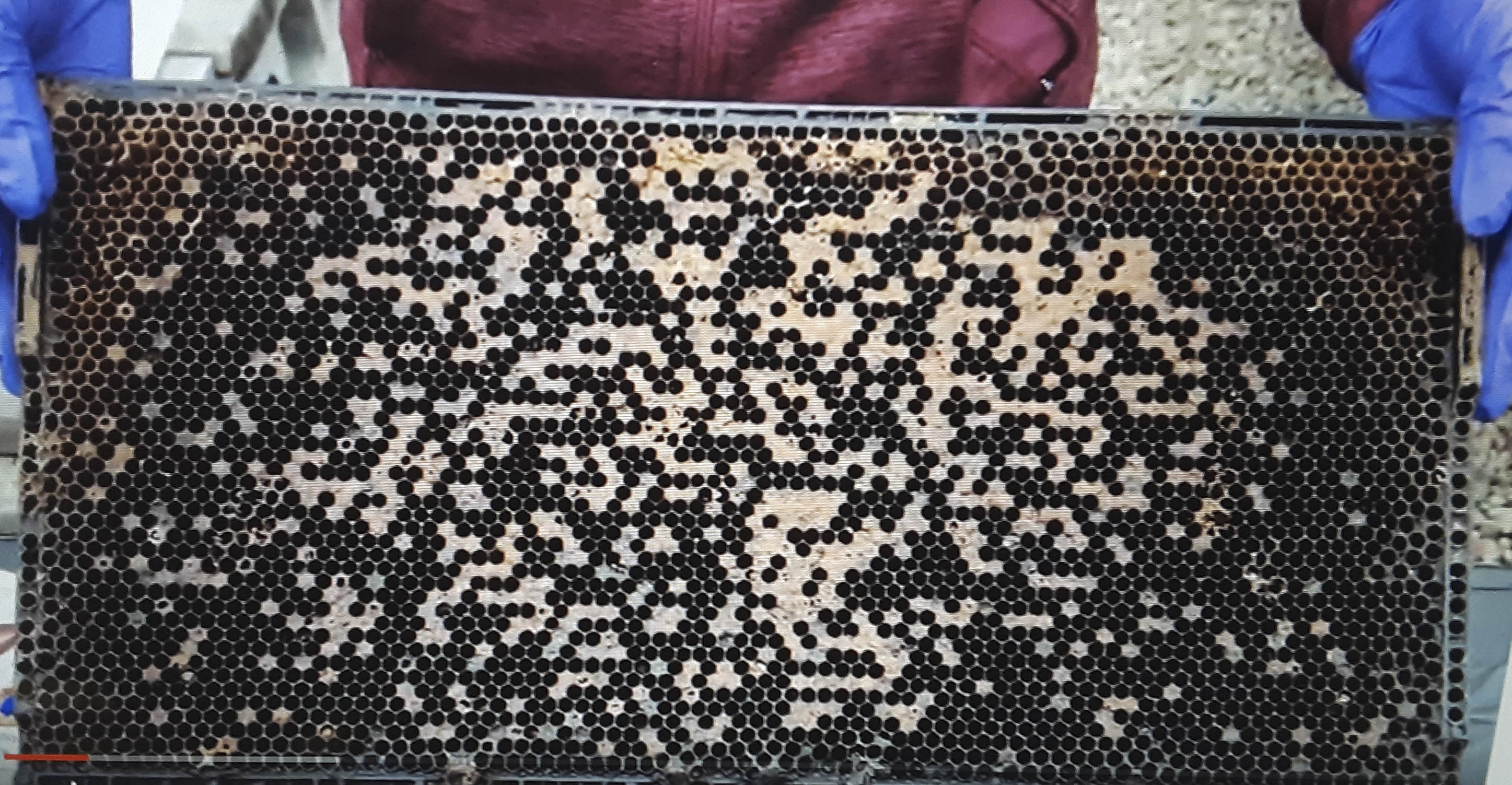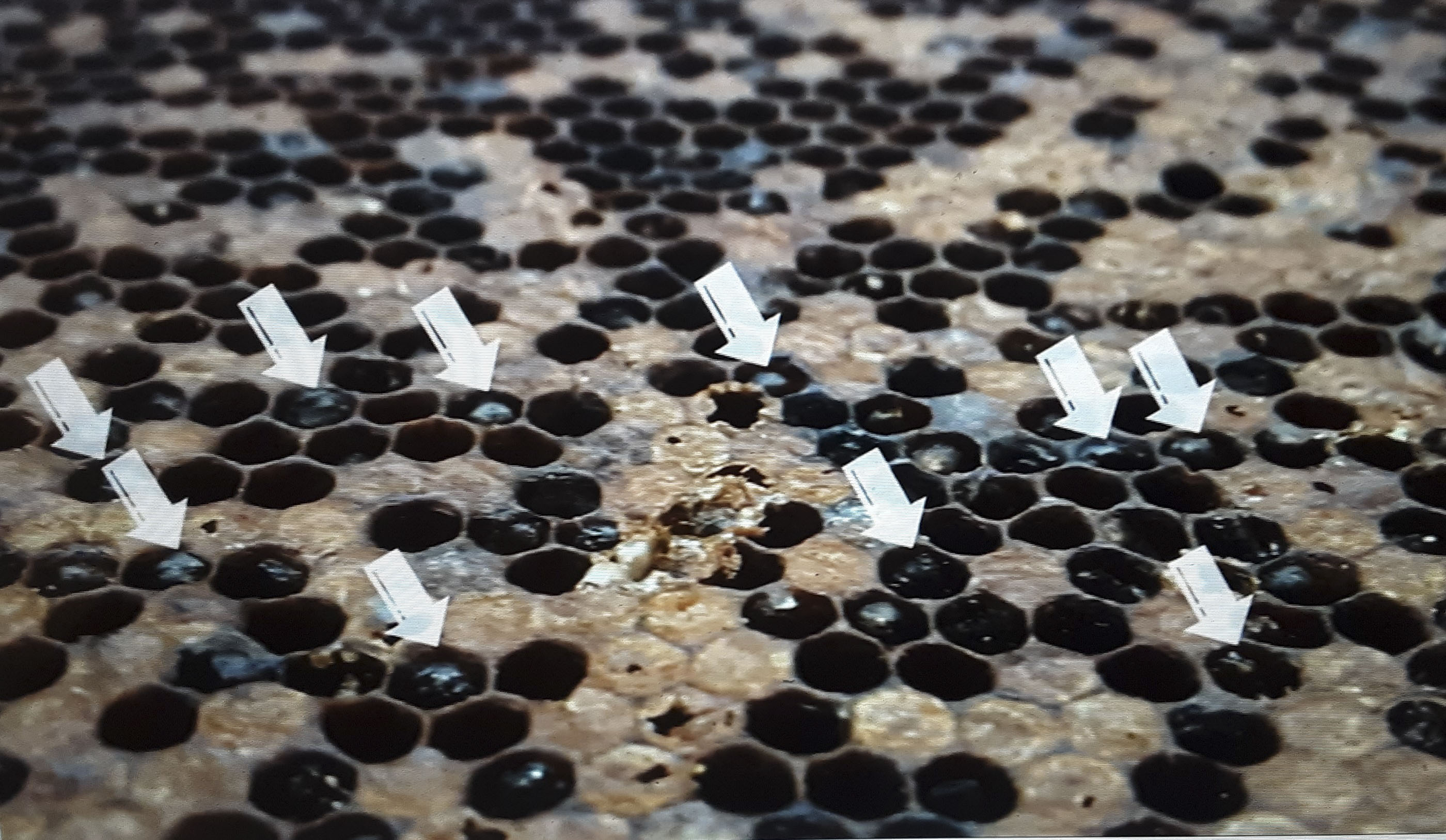 Perforated (bottom circles) and sunken (arrows) capped cells and cells showing caramel-colored, decomposing pupa (circles at right) characteristic of AFB; photo by Robert Snyder