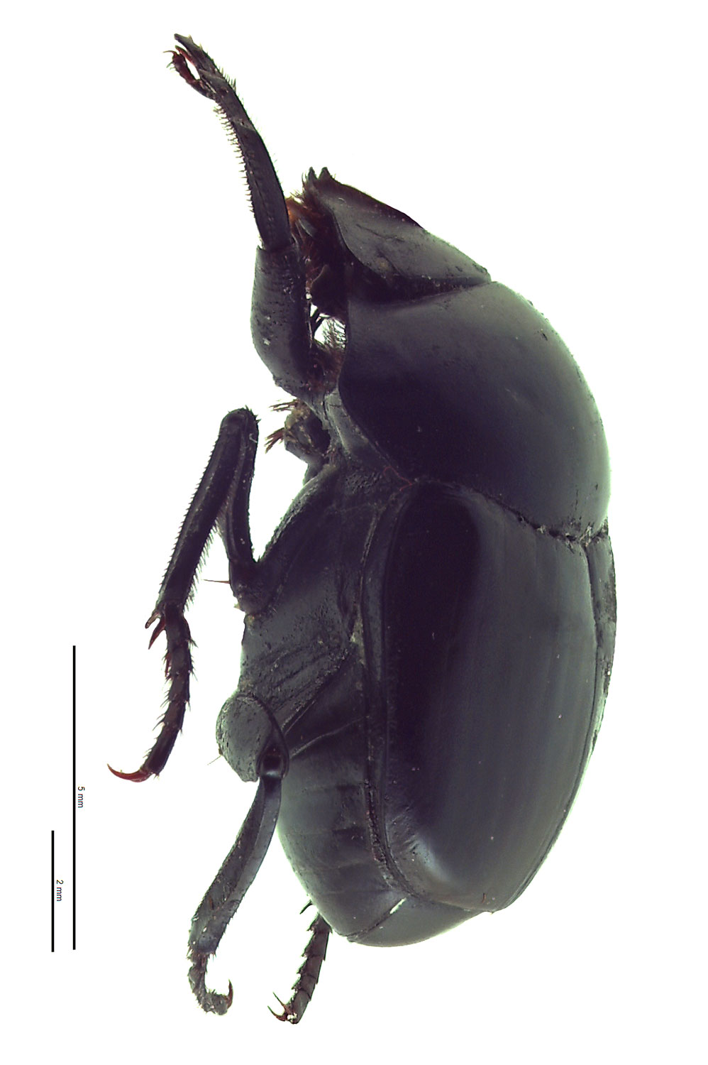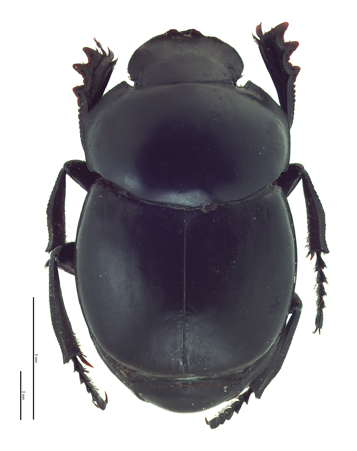 Total body length 10.0–17.0 mm (0.39–0.67 in). Body shape round (dorsal view); may be caked in dried dung. Color dark blue-black; weakly metallic. Eyes crescent shaped; longer than wide. Clypeusclypeus: