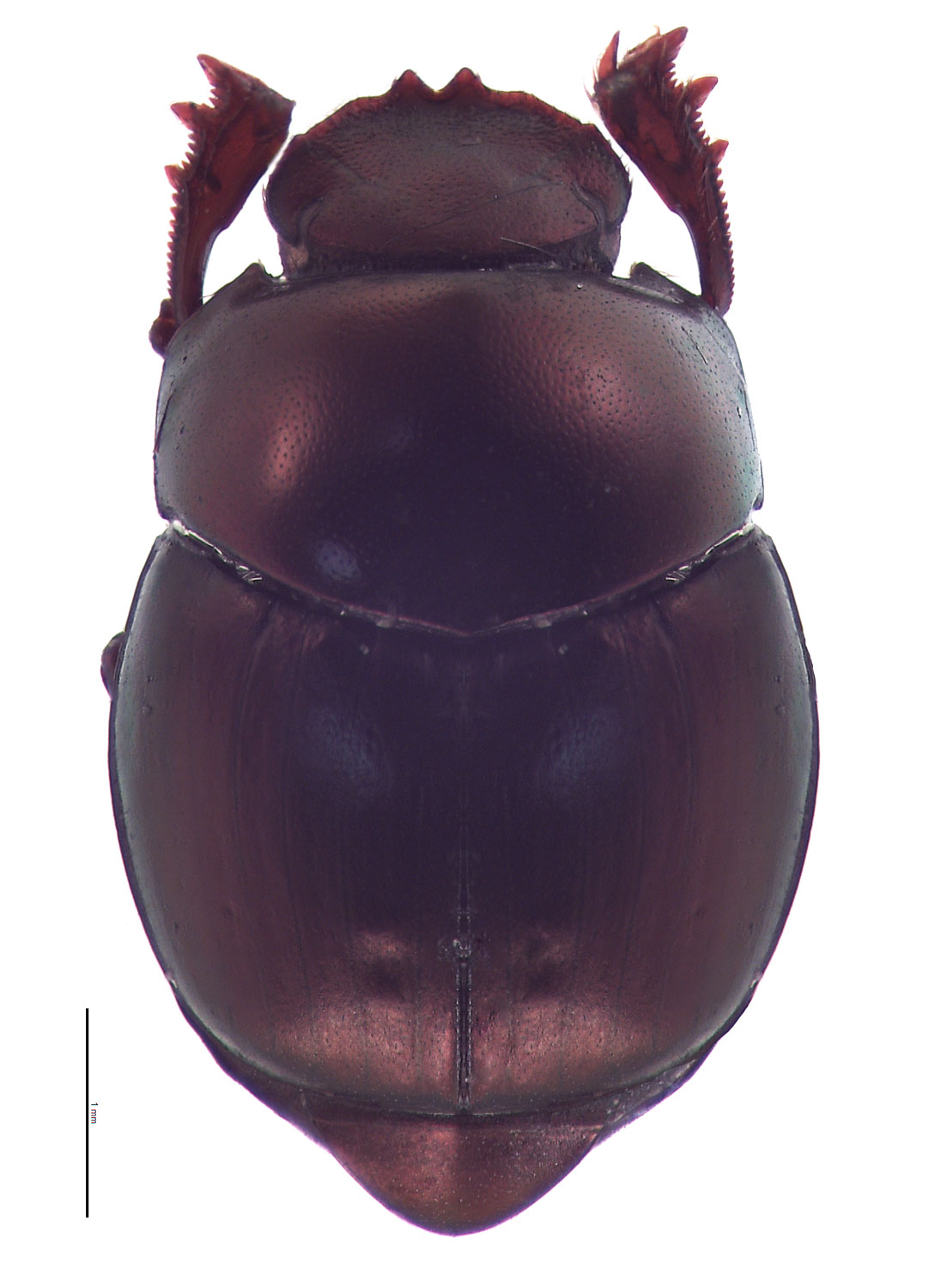 Total body length 2.0–4.0 mm (0.08–0.16 in). Body shape round (dorsal view); may be caked in dried dung. Color metallic shining green, sometimes metallic coppery red. Eyes crescent shaped, longer than wide. Clypeusclypeus: