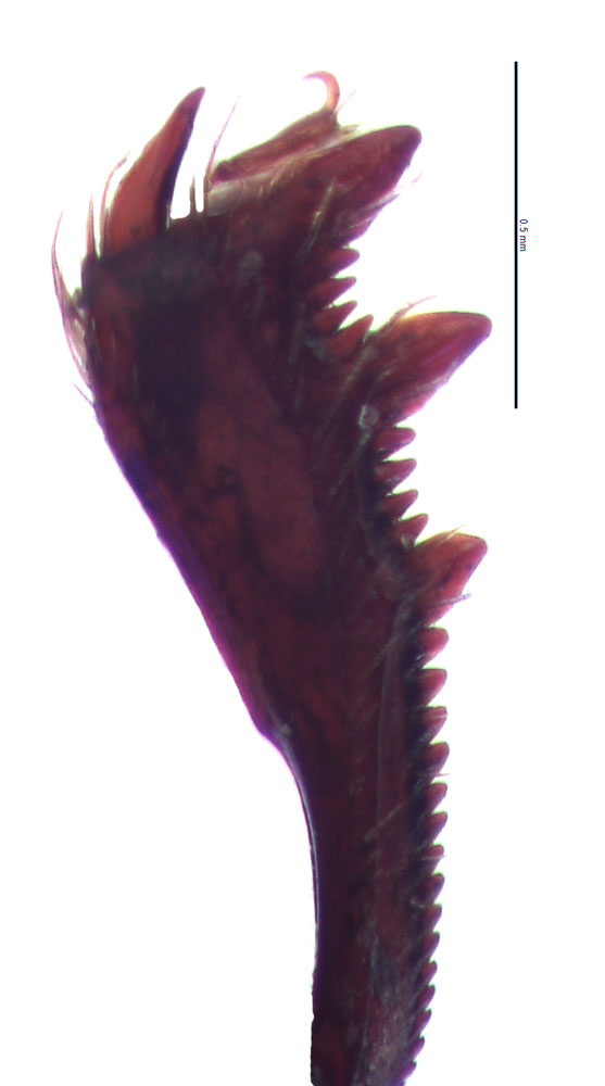 projecting, angular process on each side. Legs each with a single long, terminal setaseta: