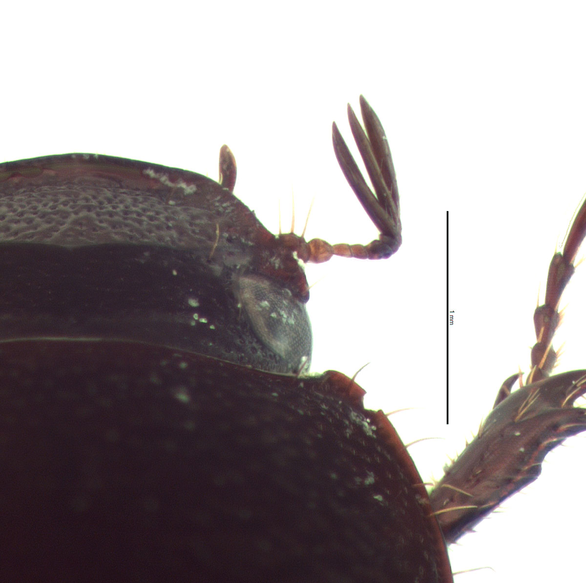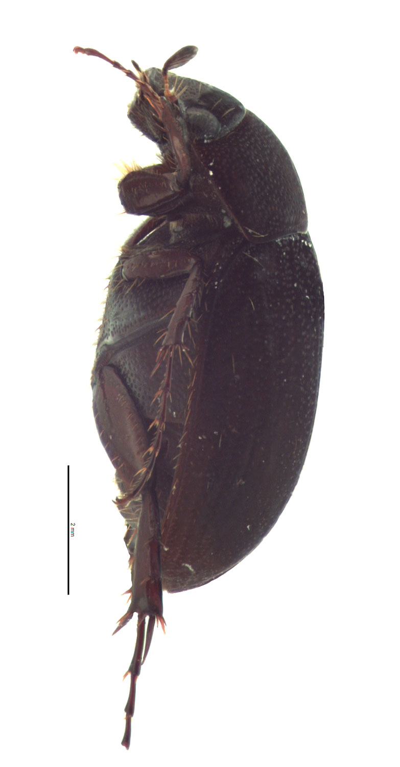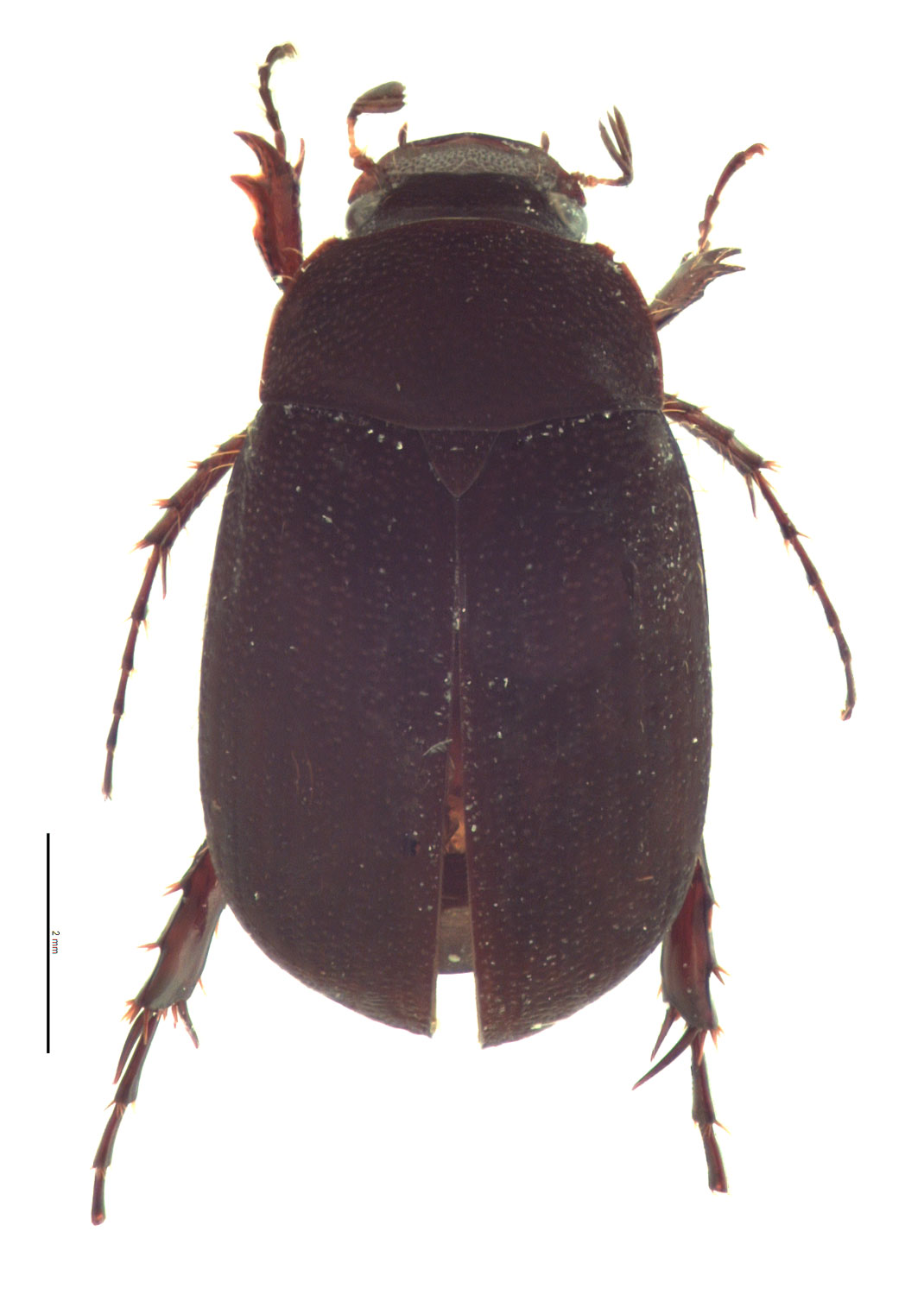 Total body length 7.0–10.0 mm (0.28–0.39 in). Body shape oblong-oval, widest posteriorly; convex when viewed laterally. Color dark-brown without iridescent sheen. Clypeusclypeus: