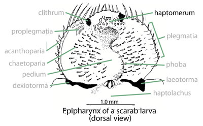 Ritcher P. 1966. White grubs and their allies: a study of North American scarabaeoid larvae. Oregon State University Monographs, Studies in Entomology 4: 1-219.): Grub C-shaped, not hump-backed, cylindrical, whitish. Cardocardo: