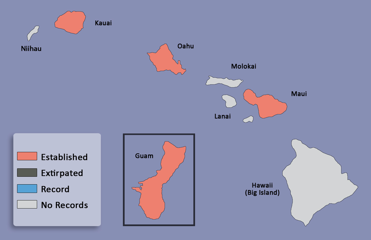 Established. While it is not clear when this species first arrived to the state, the first specimen was found in 1970 on Oahu (Hawaiian Entomological Society, 1977Hawaiian Entomological Society, 1977:
