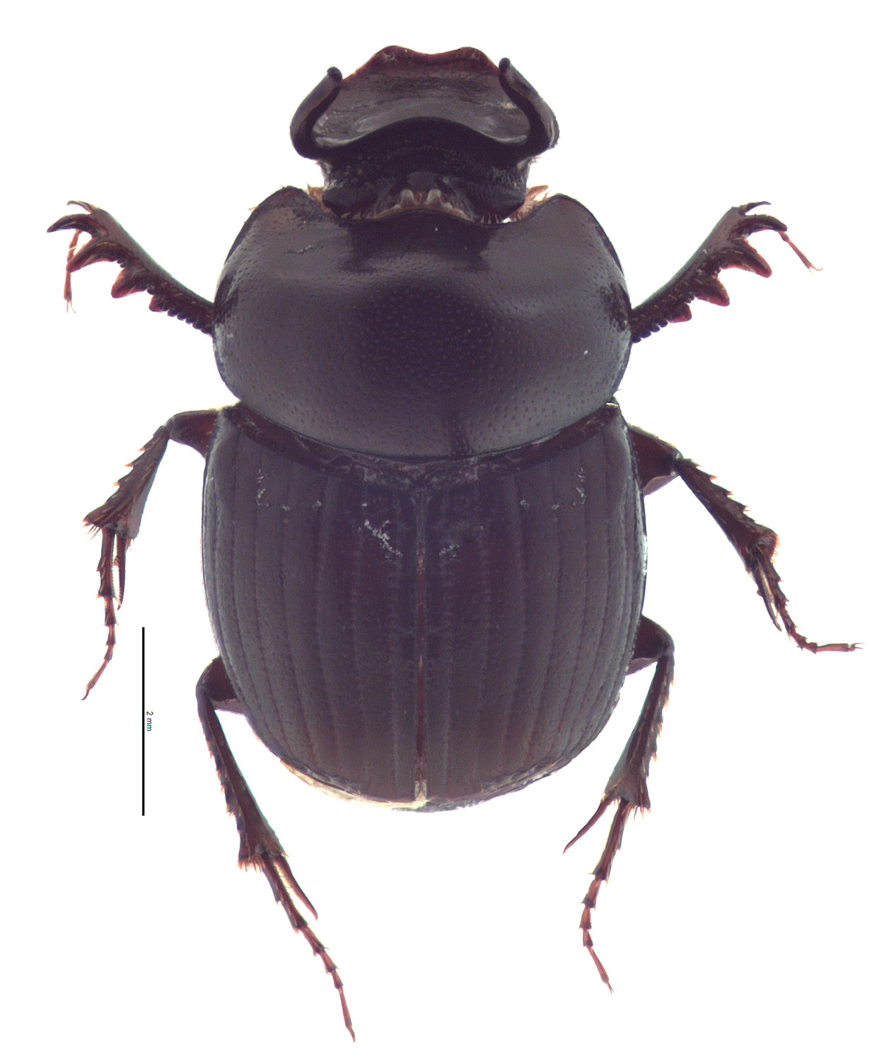 Total body length 6.0–10.0 mm (0.24–0.39 in). Body shape oval; may be caked in dung. Color shiny black. Small or medium-sized Onthophagus, over 6 mm. Clypealclypeal: