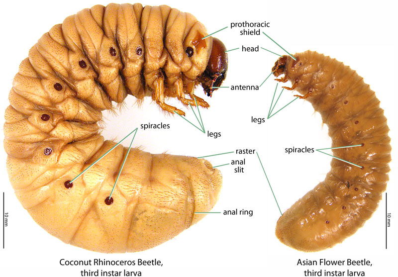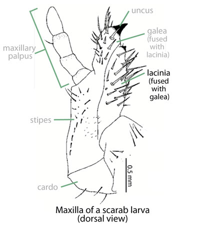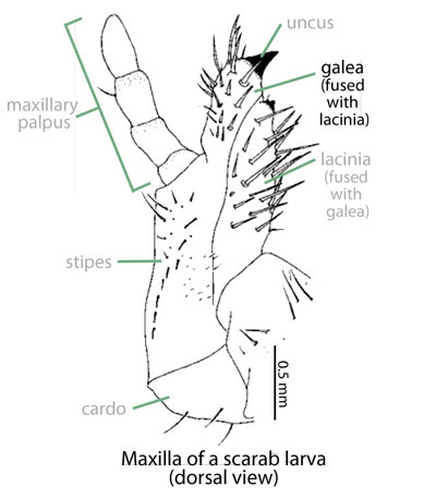 Ritcher P. 1966. White grubs and their allies: a study of North American scarabaeoid larvae. Oregon State University Monographs, Studies in Entomology 4: 1-219.): Grub C-shaped, hump-backed, cylindrical, and cream-colored. Maxillamaxilla: