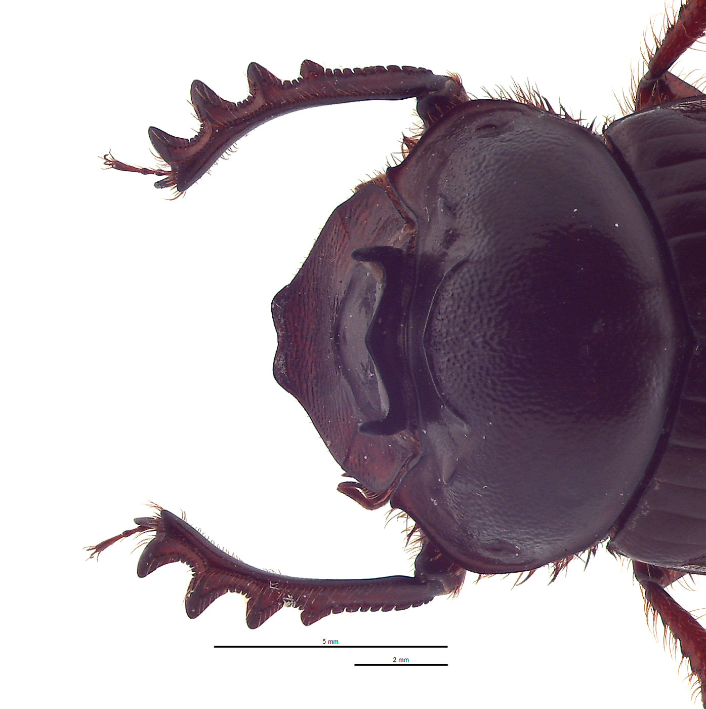Total body length 11.0–22.0 mm (0.43–0.86 in). Body shape oval; may be caked in dung. Color shiny black. Small to medium-sized Onthophagus, over 6 mm. Clypealclypeal: