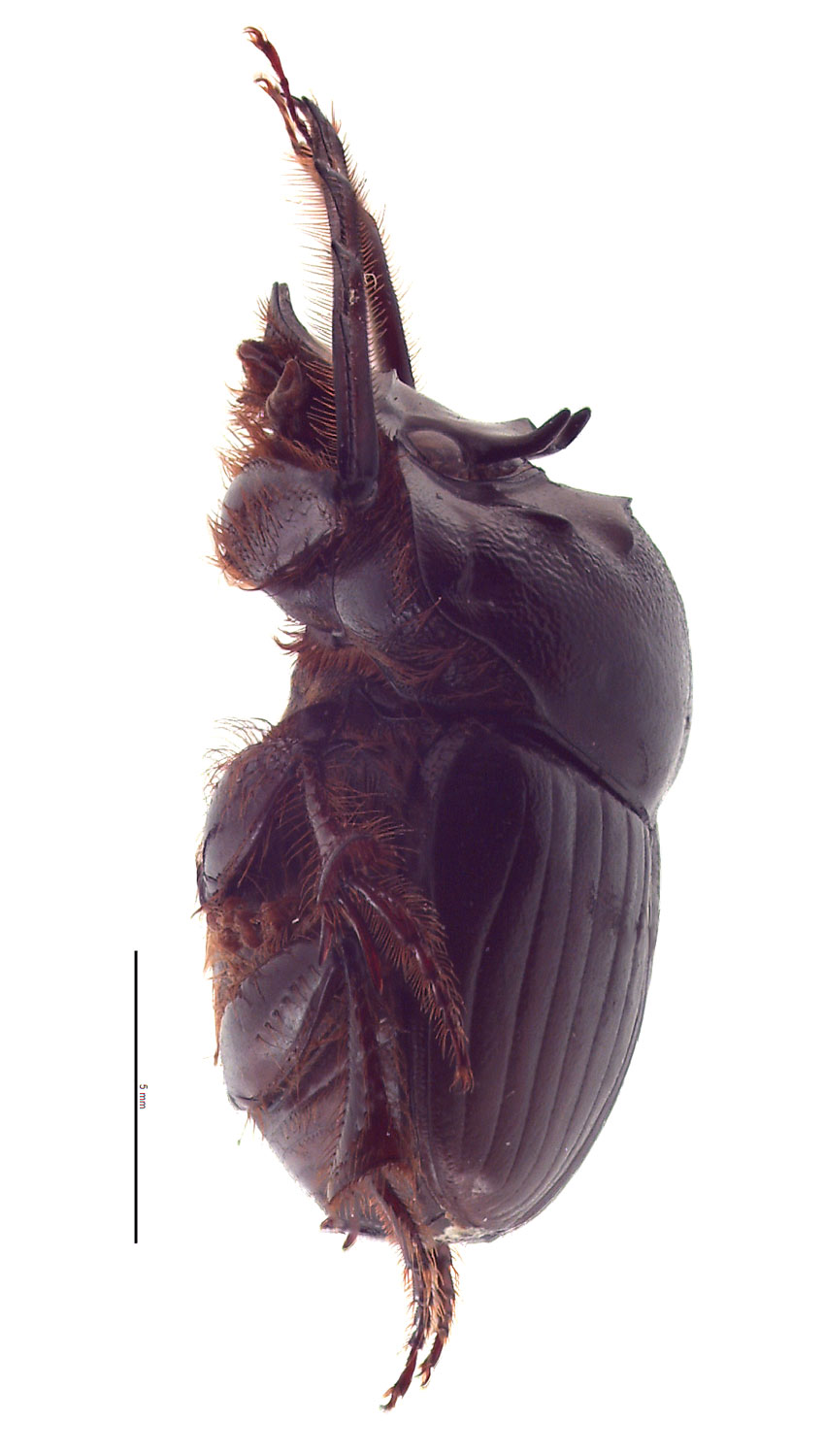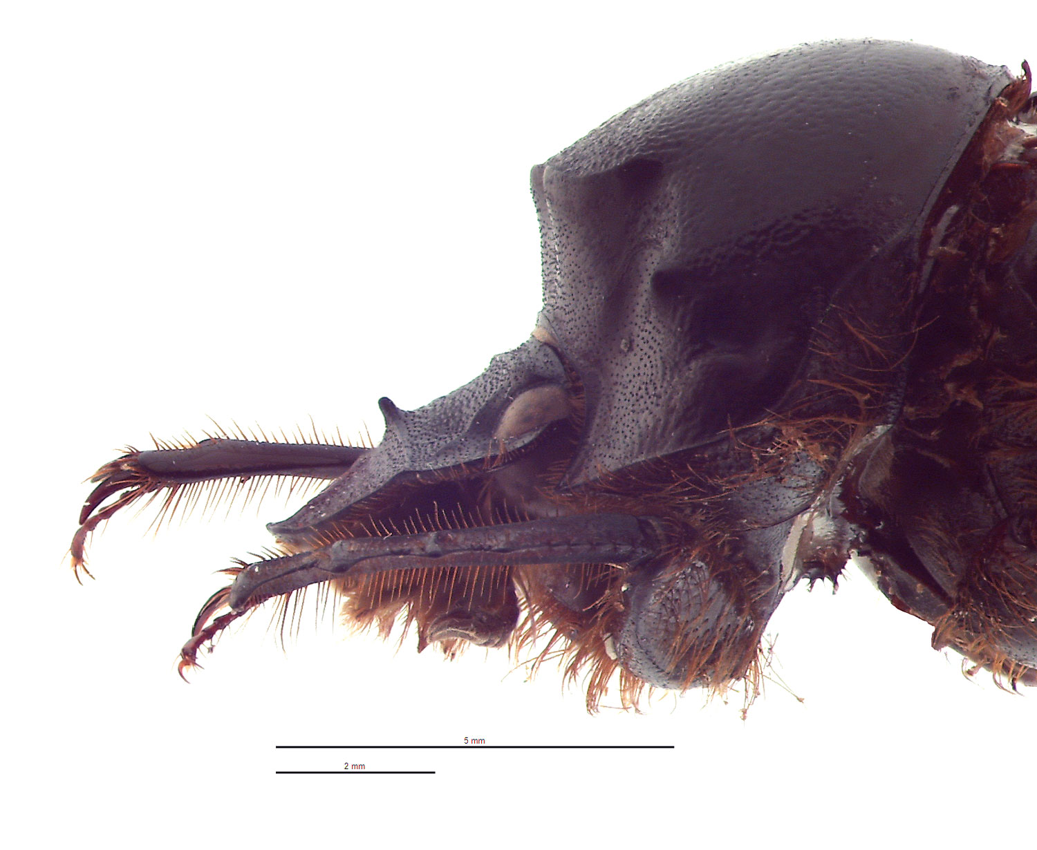 Major males of these species can be separated by examining the head armature (O. laminatus has two upward curving, non-bifurcate horns connected by a distinct ridge versus O. binodis and O. cuniculusthat lack horns or tubercles, O. incensusand O. comperei that lack a ridge between the horns, O. armatus that has a distinctly bisinuatebisinuate: