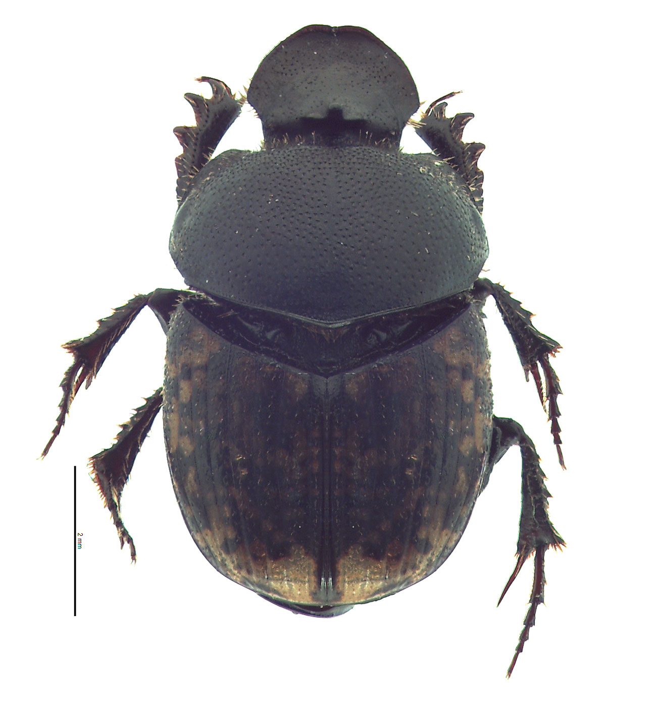 brown, mottled with black. Small-sized dung beetle, 6-10 mm. Clypealclypeal: