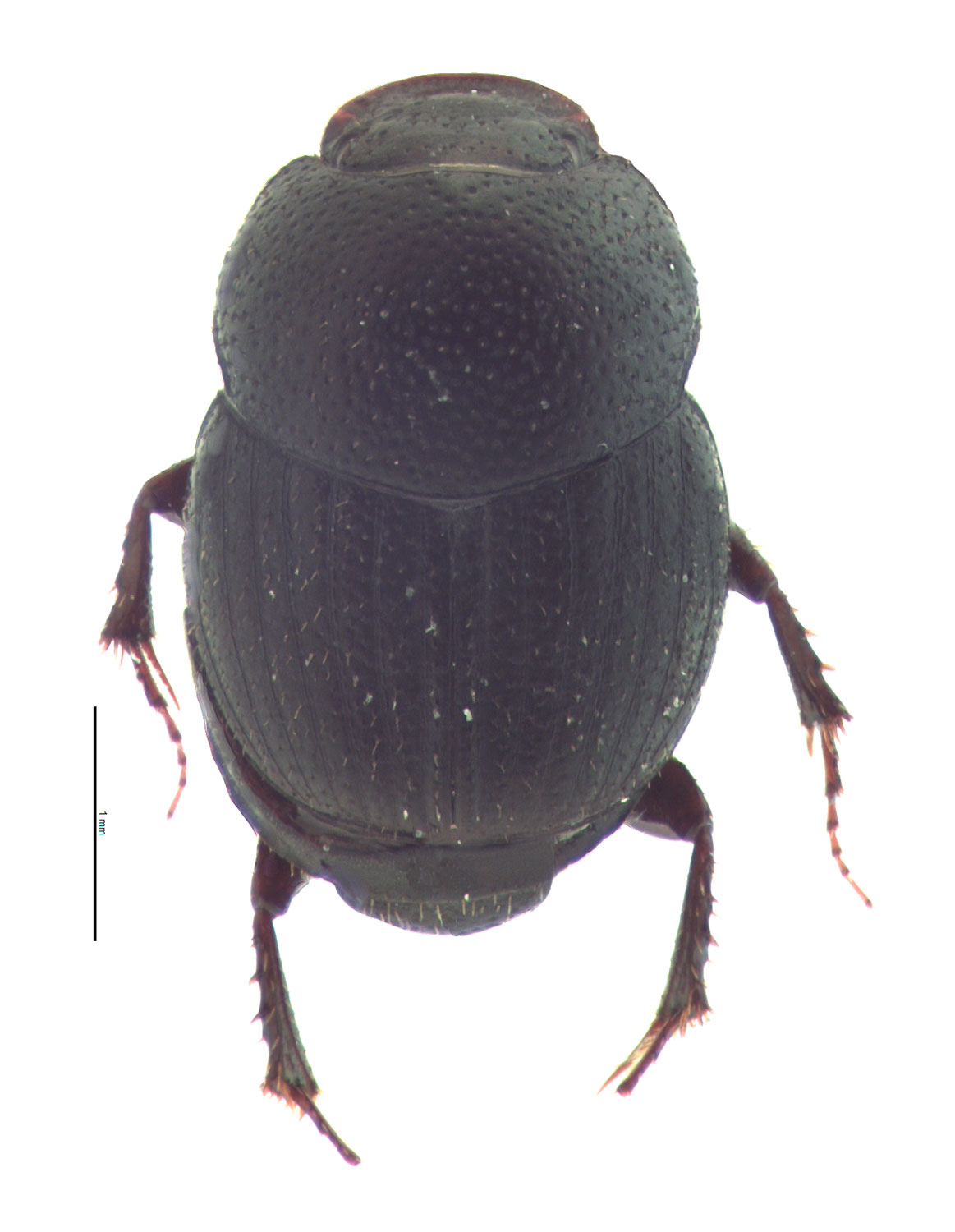 Total body length 2.0–4.1 mm (0.07–0.16 in). Body shape oval; may be caked in dung. Color shiny black. Size tiny, under 6 mm. Clypealclypeal: