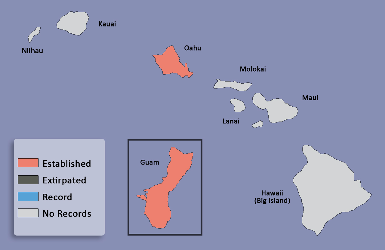 Established. This species is currently established on Oahu where it was first detected in December 2013 on Pearl Harbor-Hickam Joint Base (Hawaii Department of Agriculture, 2014Hawaii Department of Agriculture, 2014: