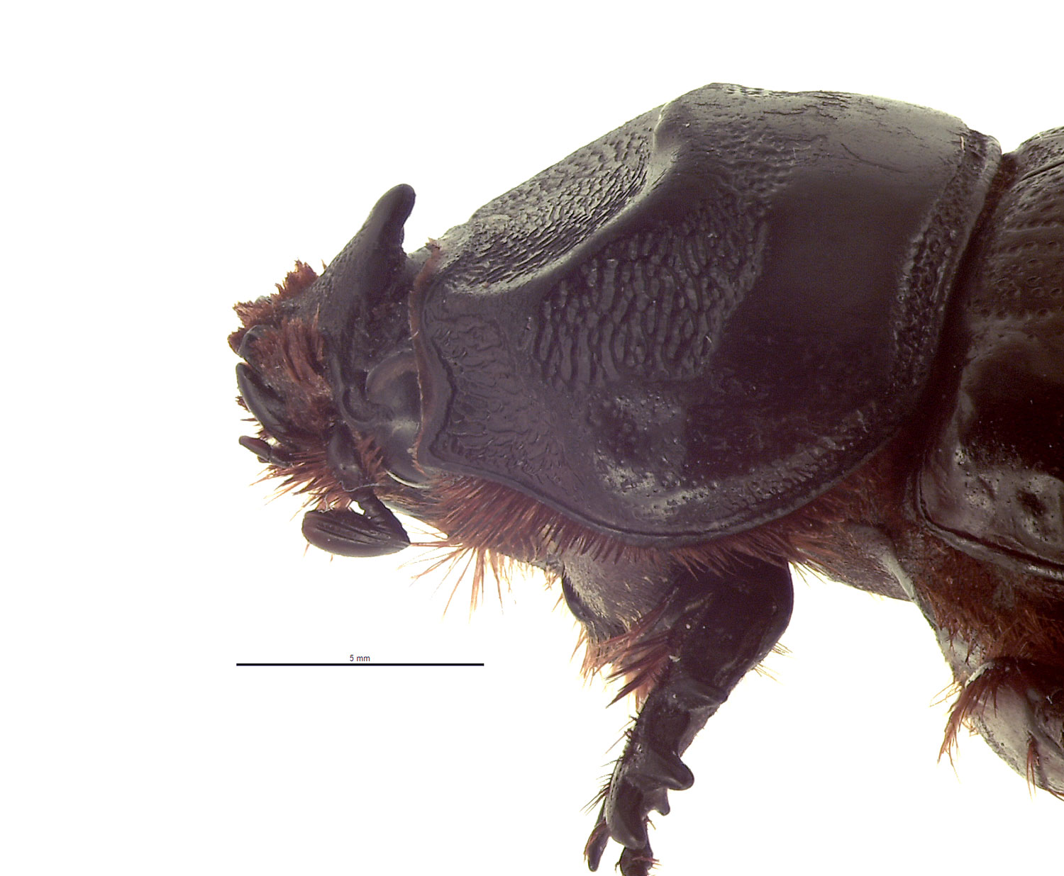 ) and the form of the pronotal depression (O. rhinoceros with broad, sculpted depression versus Xylotrupes without an anterioranterior: