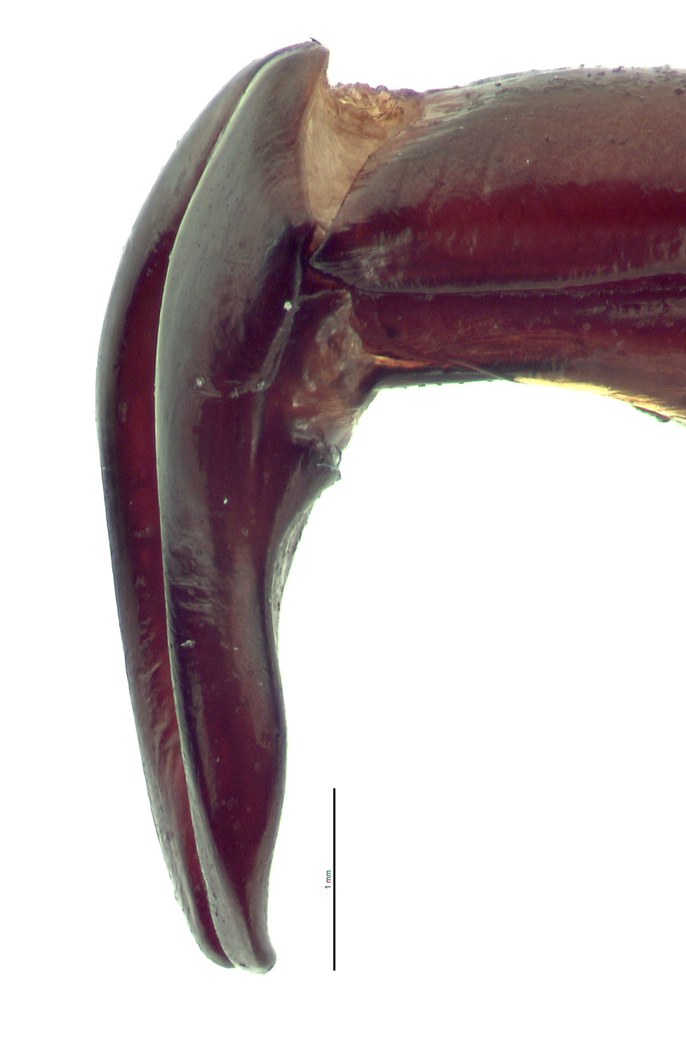 Males of these species can readily be separated by examining the male head horn (Oryctes rhinoceros with a single unbranched horn that ends in single point versus Xylotrupes with a bifurcatebifurcate: