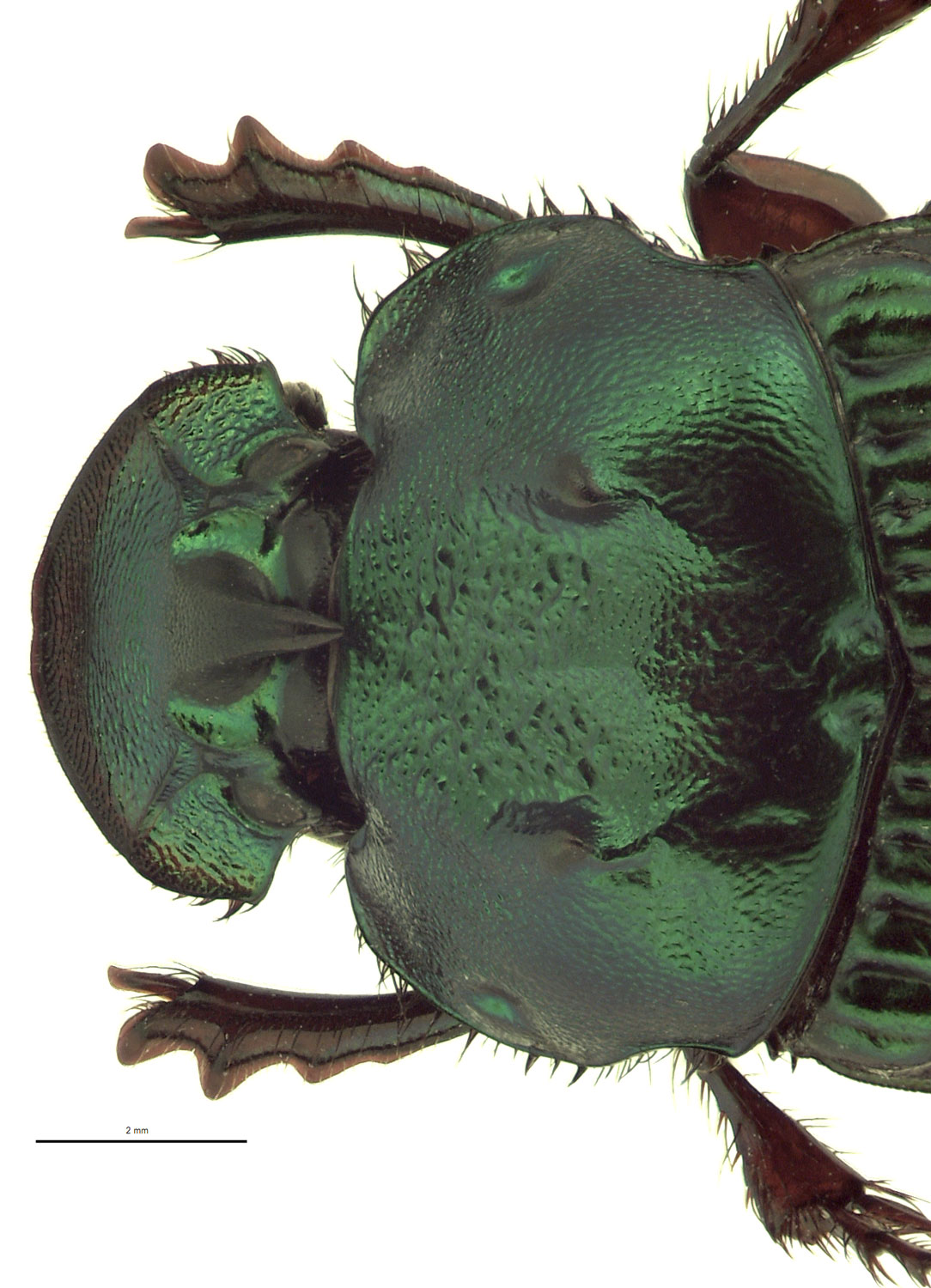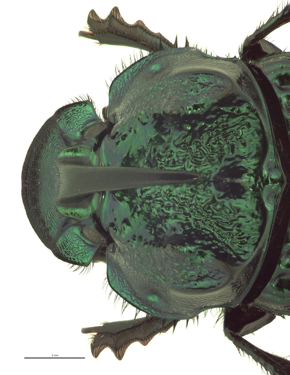 Total body length 13.0–19.0 mm (0.51–0.74 in). Color metallic green, rarely blue or yellow-green. Head of major male with single large horn; horn reduced in minor males, lacking in female. Clypeusclypeus: