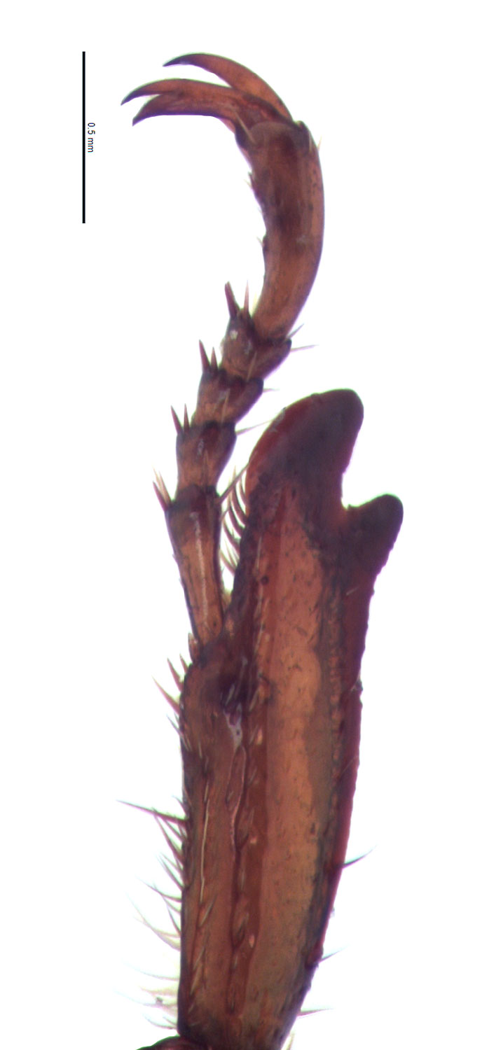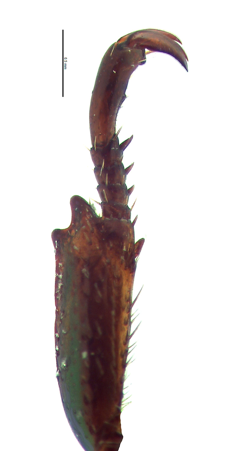 . Front claw toothed, male with toothed claw more robust than in female. Pronotumpronotum: