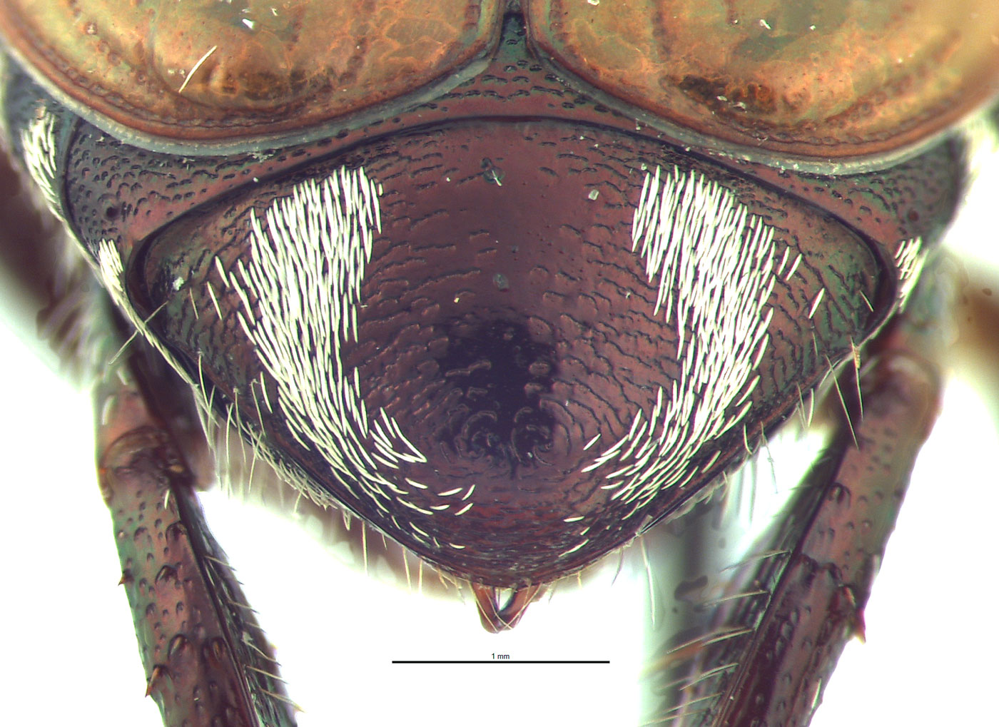 with 2 crescent-shaped patches formed by dense, whitish setaesetae: