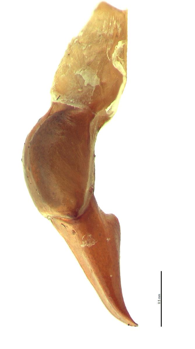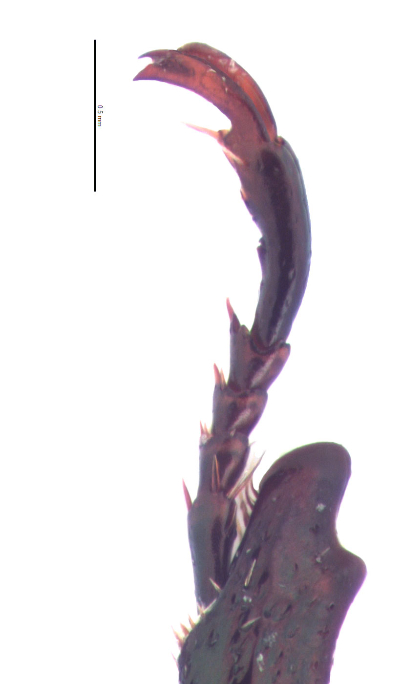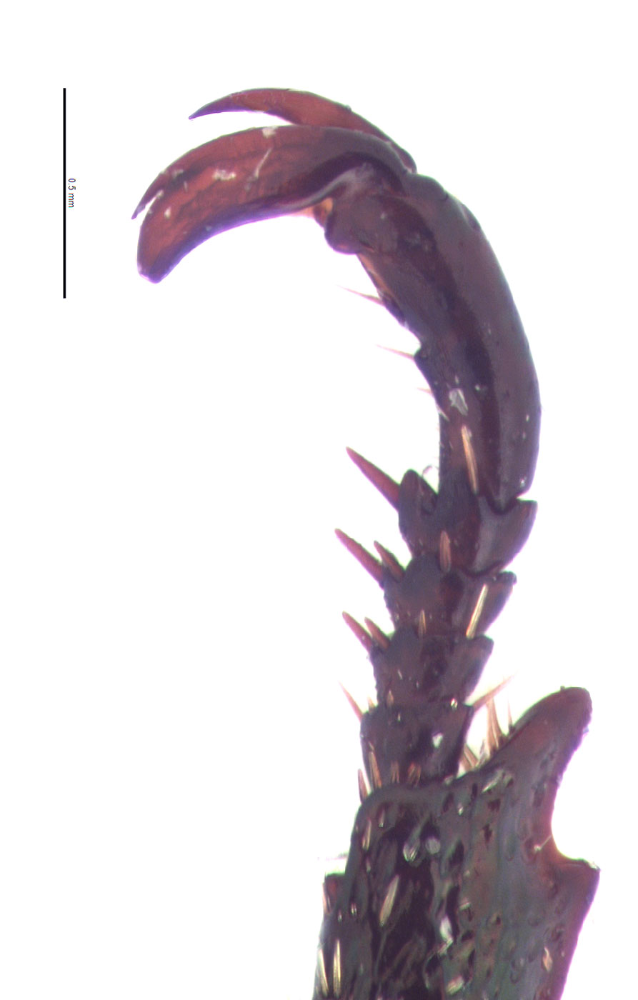 . Front claw toothed, male with toothed claw more robust than in female. Pronotumpronotum: