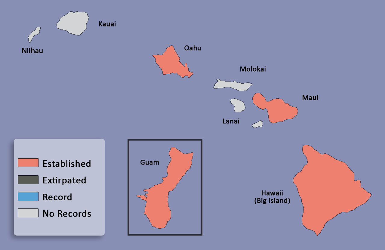 Moore A. 2012. Guam as a source of new insects for Hawaii. Pacific Entomology Conference, Portland, Oregon 2012. Available from http://guaminsects.myspecies.info/sites/guaminsects.myspecies.info/files/GuamHawaiiBugConnection.pdf (accessed 2015).). However, populations did not become established on Oahu until 2002. The species reached Maui in 2010 and Big Island in 2013 (LeBlanc et al., 2013LeBlanc et al., 2013: