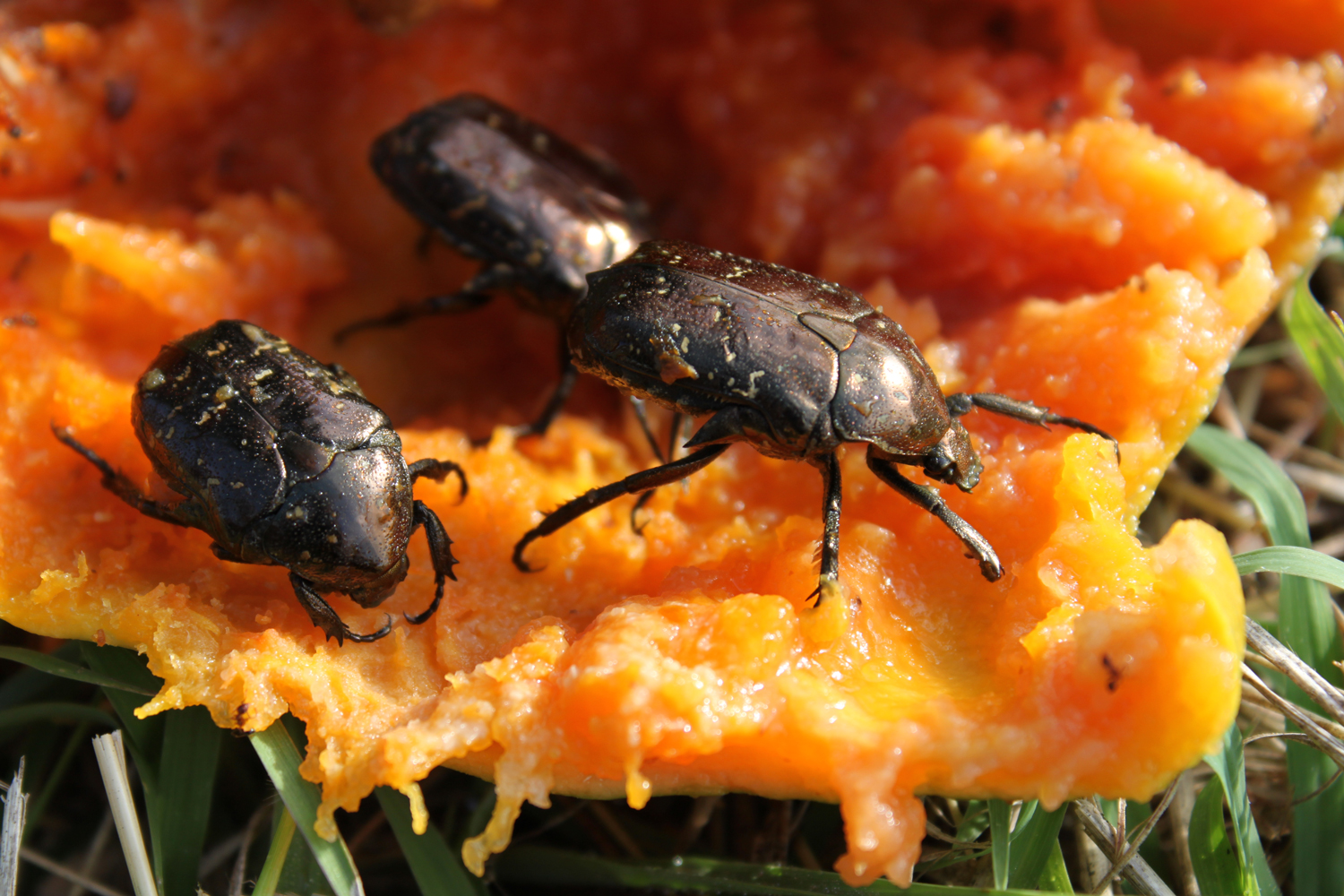Leblanc L, Graham S, Pohlman K, Fujita B. 2013. Protaetia orientalis (Coleoptera: Scarabaeidae) attracted to methyl eugenol fruit fly lure. Proceedings of the Hawaiian Entomological Society 45: 45–48. full text (accessed 2015)). Beetles are, however, capable of causing a degree of mechanical damage to surrounding healthy fruits or flowers with their sharp tarsal claws when they clamber towards fruit (LeBlanc et al., 2013LeBlanc et al., 2013: